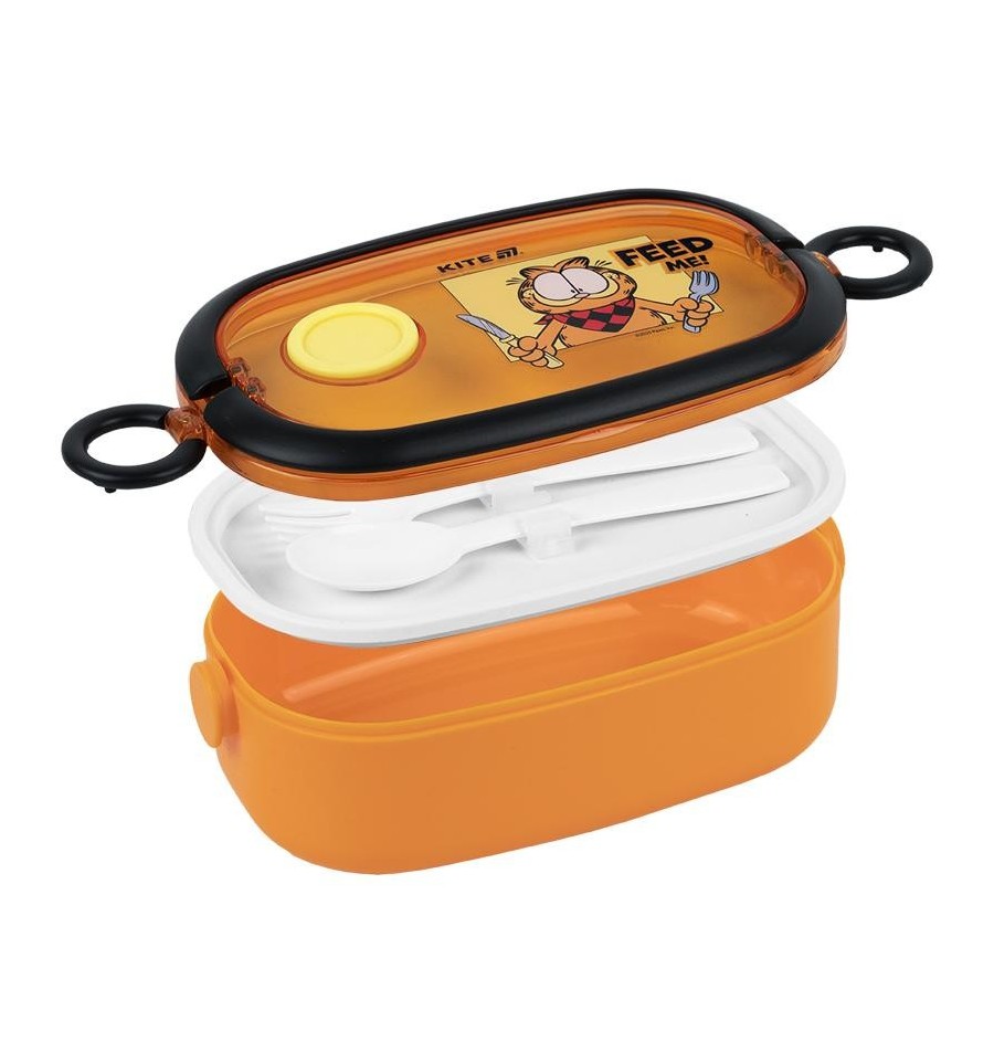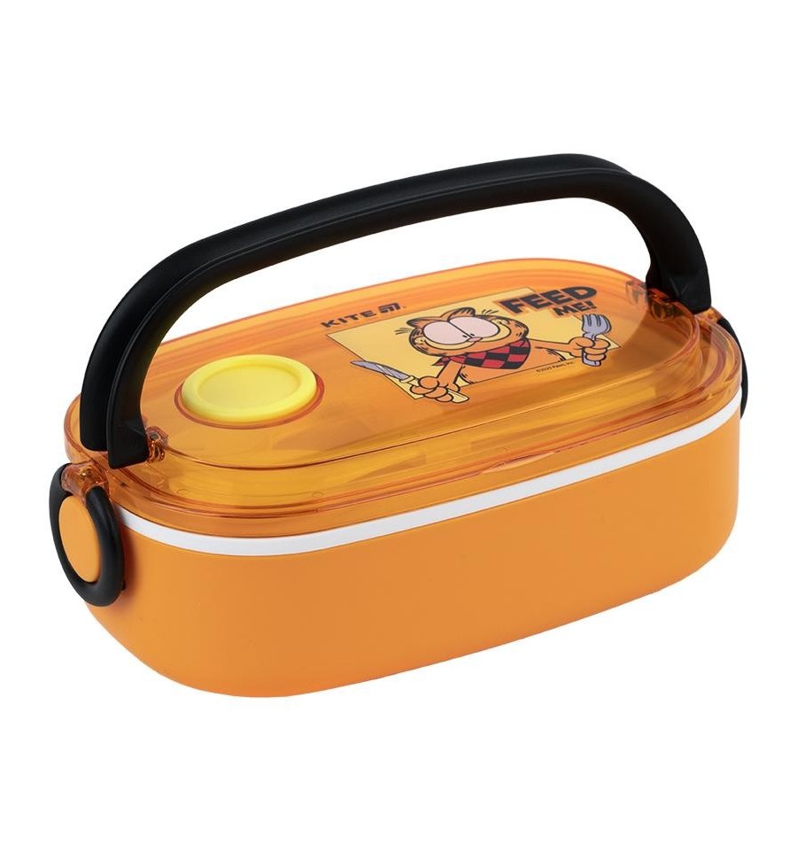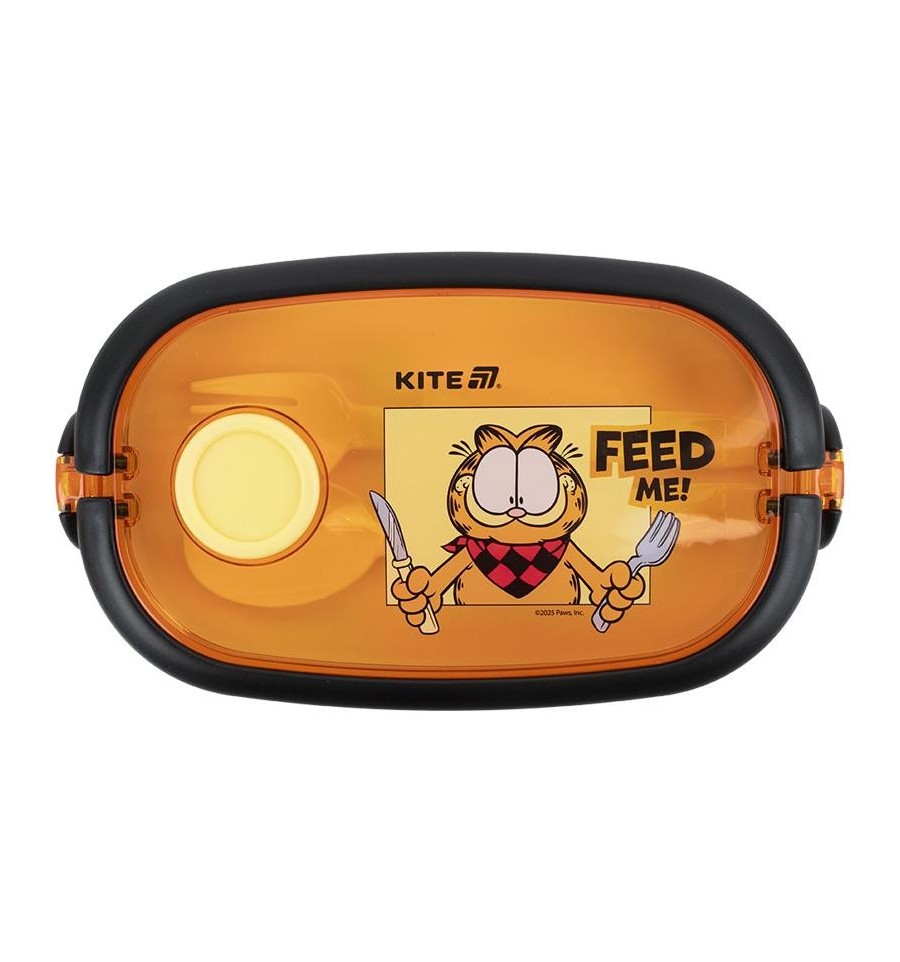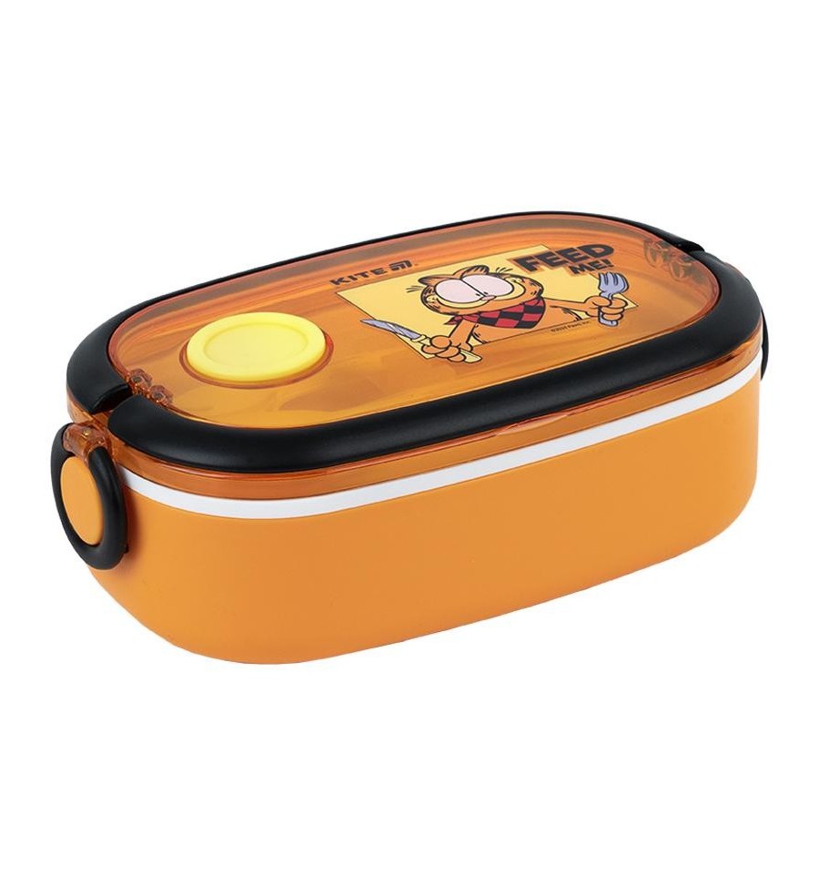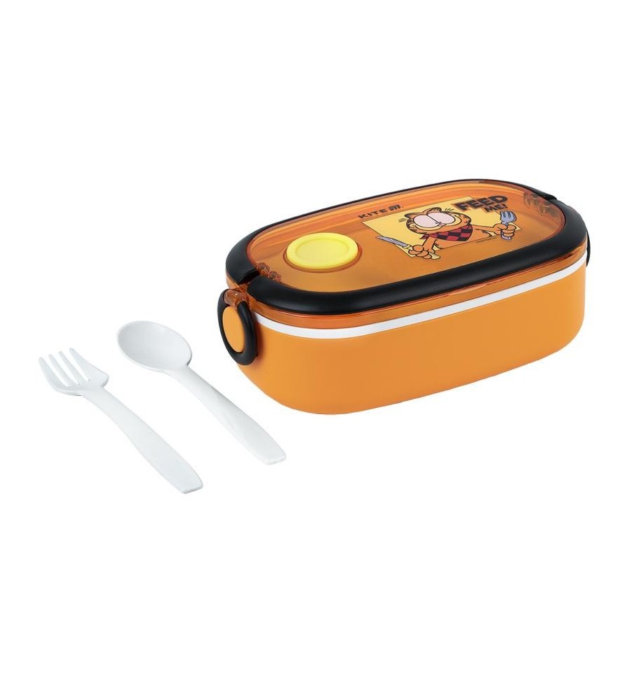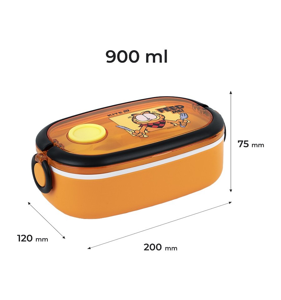 Ланчбокс Kite GF25-1180 900 мл – стильный и вместительный контейнер для обеда, незаменимый для школы, офиса, прогулок, пикников и путешествий.Контейнер изготовлен из безопасного пищевого пластика, который не впитывает запахи, не содержит бисфенол-А и не изменяет вкус пищи.Крышка с клапаном позволяет разогревать блюдо в микроволновке (достаточно просто открыть клапан), а надежные боковые защелки надежно его фиксируют.Внутри – вместительное отделение для ваших любимых блюд.В комплекте есть пластиковая ложка и вилка, удобно зафиксированная внутри.Яркий дизайн в лицензии Garfield будет ежедневно поднимать настроение. Рыжий пушист очень любит поесть и с радостью составит вам компанию.Особенности:объем 900 мл - для сытного обеда на весь день; безопасный пищевой пластик без BPA – не впитывает запахов, не влияет на вкус; крышка с клапаном – удобно разогревать в микроволновке; прочные боковые защелки - все плотно закрывается; ложка и вилка в комплекте – не нужно брать отдельные столовые приборы; подходит для хранения в холодильнике и мойки в посудомоечной машине; стильный дизайн в любимой лицензии Garfield; размер 20х12х7,5см.