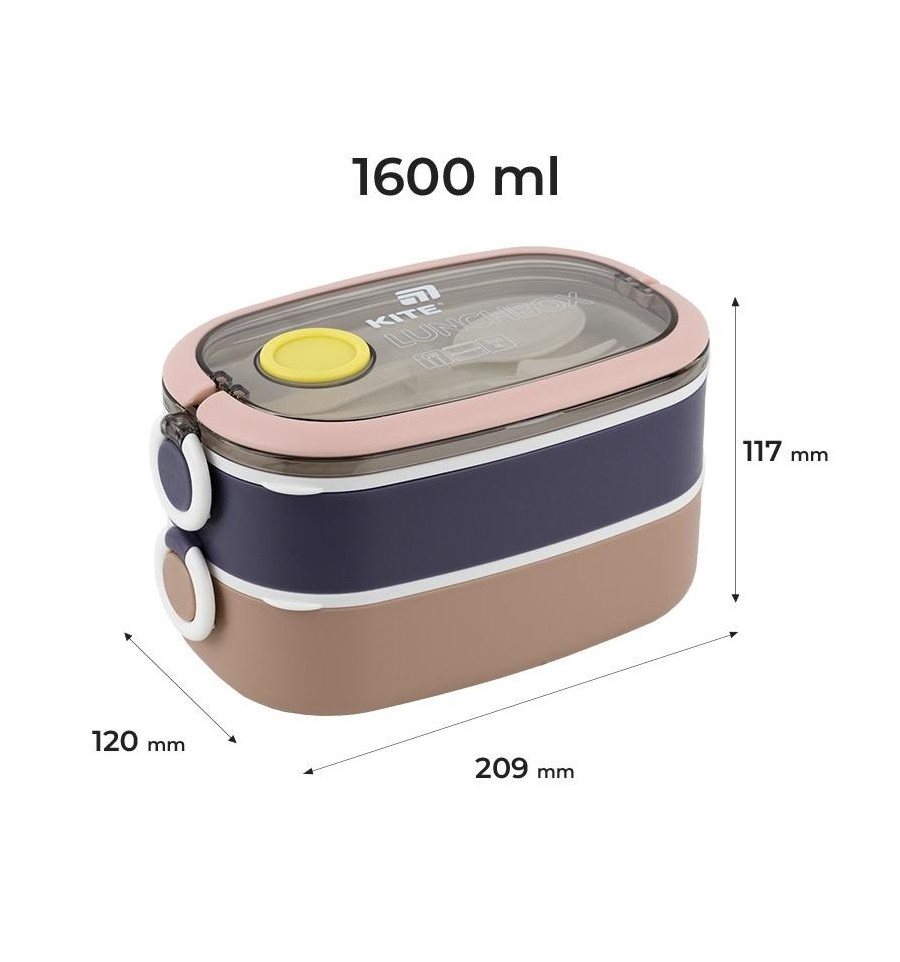Ланчбокс двойной Kite K25-1181-1 1600 мл – универсальный и вместительный контейнер для полноценного обеда, адаптирующийся под ваш ритм жизни. Идеален для школы, офиса, прогулок, пикников и путешествий. Благодаря двум отделениям с дополнительными крышками, вы сами решаете сколько взять с собой: одну емкость или обе сразу.Контейнер изготовлен из безопасного пищевого пластика, который не впитывает запахи, не содержит бисфенол-А и не изменяет вкус пищи.Прозрачная верхняя крышка с клапаном позволяет разогревать блюдо в микроволновке (достаточно просто открыть клапан), а надежные боковые защелки фиксируют обе емкости вместе.Внутри два отдельных вместительных отделения, каждое с дополнительной внутренней крышкой. Можно использовать оба для большого обеда или только одно для перекуса.В комплекте есть пластиковая ложка и вилка, удобно зафиксированная внутри.Особенности:общий объем 1600 мл - для сытного обеда на весь день; 2 основных отделения с дополнительными крышками – удобно разделять блюда; можно регулировать объем – использовать одну или две емкости; безопасный пищевой пластик без BPA – не впитывает запахов, не влияет на вкус; прозрачная верхняя крышка с клапаном – удобно разогревать в микроволновке; прочные боковые защелки - все плотно закрыто; ложка и вилка в комплекте – не нужно брать отдельные столовые приборы; подходит для хранения в холодильнике и мойки в посудомоечной машине; размер 20,9х12х11,7 см.