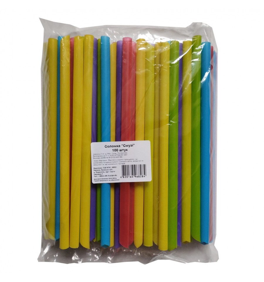 Соломка КТА Смузи 21см х 9мм 100шт/уп. Материал: полипропилен. Условия хранения: хранить в закрытых помещениях, исключающих попадание прямого солнечного света, на расстоянии не менее 1м от нагревательных приборов. Срок годности: неограниченный. Производитель: ООО КТА, ул. Сергея Оврашко 1, г. Борисполь, Киевская обл., Украина, 08301. Количество: 100шт.