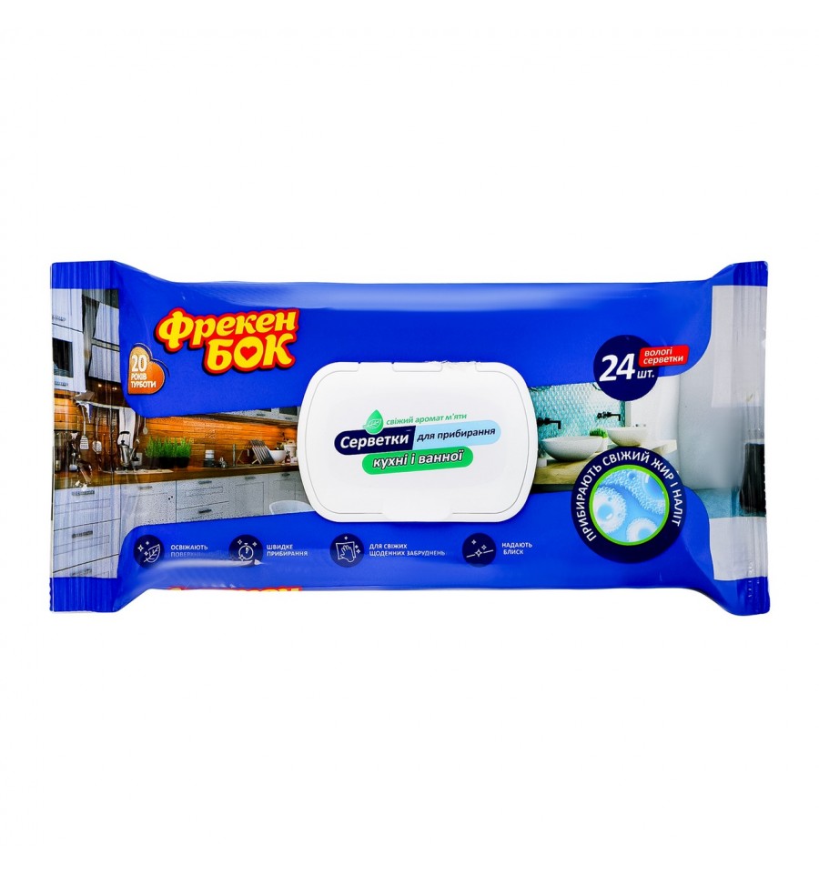 Салфетки влажные Фрекен Бок хозяйственные для кухни и ванной 24шт/уп. Состав: материал: нетканое полотно. Вода деминерализованная, смесь ПАВ <0.2%, консервант, модификатор поверхности, лимонная кислота, парфюмерная композиция. Рекомендуемые способы применения: открыть клапан, отклеить стикер, достать салфетку. Чтобы избежать высыхания салфеток, клапан плотно закрыть. Разделать поверхность несколькими движениями до блеска. При сильном загрязнении необходимо использовать несколько салфеток. После использования вымыть руки. Условия хранения: хранить при температуре -20..+30ºC. Без попадания прямых солнечных лучей. Меры предосторожности: использовать по назначению. Не использовать в качестве средств гигиены, продуктов питания и посуды. Избегать попадания в глаза. Хранить в недоступном для детей и животных месте. Хранить на расстоянии не менее 1м от нагревательных приборов и систем отопления. Не использовать влажные салфетки в замороженном состоянии. Срок годности: 2 года. Страна изготовитель: Украина. Производитель и адрес производителя: ООО КПД, ул. Тепличная, 27, пос. Слобожанское, Днепровский р-н, Днепропетровская обл., Украина, 52005. Адрес производственных мощностей: ул. Автопарковая, дом. 6, г. Днепр, Днепропетровская обл., Украина, 49127. Количество: 24шт.