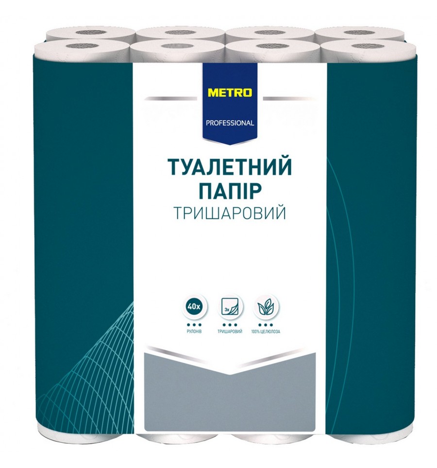 Туалетная бумага, трехслойная ТМ «METRO Professional». Ширина: 90±5 мм (мм), диаметр 105±5 мм (мм). Количество рулонов: 40 рулонов. Количество отрывов: 130 листов ±5%. Состав: 100% целлюлоза. Назначение: для санитарно-гигиенических и хозяйственно-бытовых нужд. Условия хранения: хранить в сухом месте при температуре не ниже минус 25°С на расстоянии не менее 1 m (м) от отопительных устройств и не менее 0,1 m (м) от пола. Защищать от воздействия прямых солнечных лучей. Срок годности изделий – неограниченный. Гарантийный срок: 14 дней. Производитель/адрес мощностей производства: ЧАО «ВГП», ул. Георгия Гонгадзе, 25, г. Луцк, 43027, Украина. тел.: +38 0332 789 150.