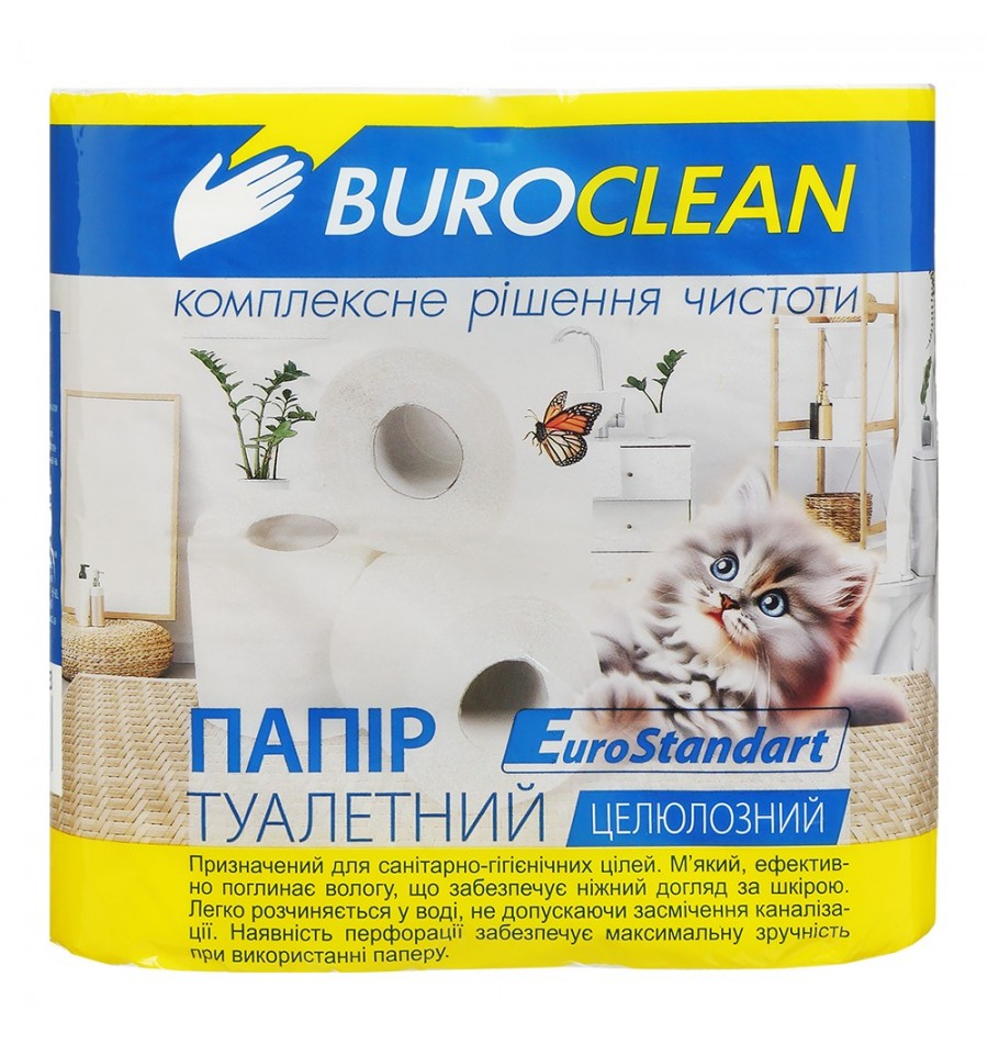 Туалетная бумага от BUROCLEAN для санитарно-гигиенических целей. Может использоваться бытовыми потребителями, общепитами, в офисах, на предприятиях, в организациях и других объектах, где необходимо использование туалетной бумаги.• мягкий, эффективно поглощающий влагу, обеспечивает бережный уход за кожей. • легко растворяется в воде, не вызывает засор канализации • наличие перфорации обеспечивает максимальное удобство при использовании бумагиТехнические характеристики: • наличие перфорации – да • количество отрывов в рулоне – 150 • тип – на гильзе • вид – стандартный • количество слоев – 2 • количество в упаковке – 4 рулона • цвет – белый • размер листа – 98×115 мм • диаметр рулона – 115 мм• диаметр втулки – 48 ммСостав: целлюлоза