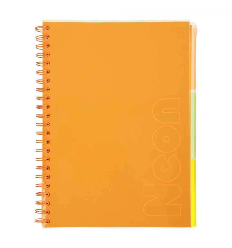 Тетрадь на пружине NEON от BUROMAX – удобный аксессуар-органайзер для ведения разнообразных записей, планов, конспектов, дневников и т.д. Наличие разделителей поможет идентифицировать и систематизировать информацию или вести разные записи в одной тетради. Большой вместительный карман на Zip-молнии можно использовать как встроенный пенал, хранить в нем различные мелкие записки, карточки и письменные принадлежности. Такая тетрадь пригодится работникам разных сфер деятельности, офисным сотрудникам, студентам и школьникам, а также для использования в быту.120 листов формат А4 (размер блока 210х297 мм) гибкая обложка из прозрачного глянцевого тонированного PVC-пластика (толщина 500 мкм), защитит записи от воздействия влаги и грязи. внутренний блок из офсетной белой бумаги плотностью 70 г/м² крепеж: металлическая вертикальная пружина (сбоку), позволяющая легко переворачивать листы и удобно писать на обеих сторонах разворота. линирование: клеточка, двусторонняя, с узкой рамкой по периметру, выполнена мягким серым цветом, приятным для восприятия человеком блок имеет 3 разноцветных пластиковых разделителя размером 222х297 мм. задняя обложка тетради выполнена в виде глубокого кармана, закрывающегося с помощью Zip-молнии. листы блока имеют перфорацию (4 отверстия) для подшивки в разные типы быстросшивателей. цвет неоновый оранжевый