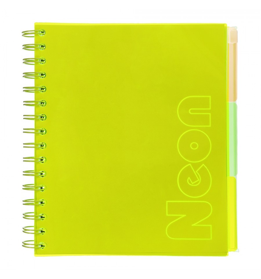 Тетрадь на пружине NEON от BUROMAX – удобный аксессуар-органайзер для ведения разнообразных записей, планов, конспектов, дневников и т.д. Наличие разделителей поможет идентифицировать и систематизировать информацию или вести разные записи в одной тетради. Большой вместительный карман на Zip-молнии можно использовать как встроенный пенал, хранить в нем различные мелкие записки, карточки и письменные принадлежности. Такая тетрадь пригодится работникам различных сфер деятельности, офисным сотрудникам, студентам и школьникам, а также для использования в быту.120 листов формат ≈ В5 (размер блока 170х205 мм) гибкая обложка из прозрачного глянцевого тонированного PVC-пластика (толщина 500 мкм), защитит записи от воздействия влаги и грязи. внутренний блок из офсетной белой бумаги плотностью 70 г/м² крепеж: металлическая вертикальная пружина (сбоку), позволяющая легко переворачивать листы и удобно писать на обеих сторонах разворота. линирование: клеточка, двусторонняя, с узкой рамкой по периметру, выполнена мягким серым цветом, приятным для восприятия человеком блок имеет 3 разноцветных пластиковых разделителя размером 182х205 мм. задняя обложка тетради выполнена в виде глубокого кармана, закрывающегося с помощью Zip-молнии. листы блока имеют перфорацию для подшивки в быстросшиватель. цвет неоновый желтый