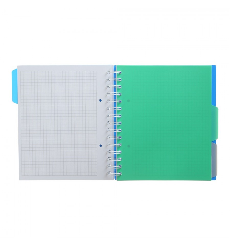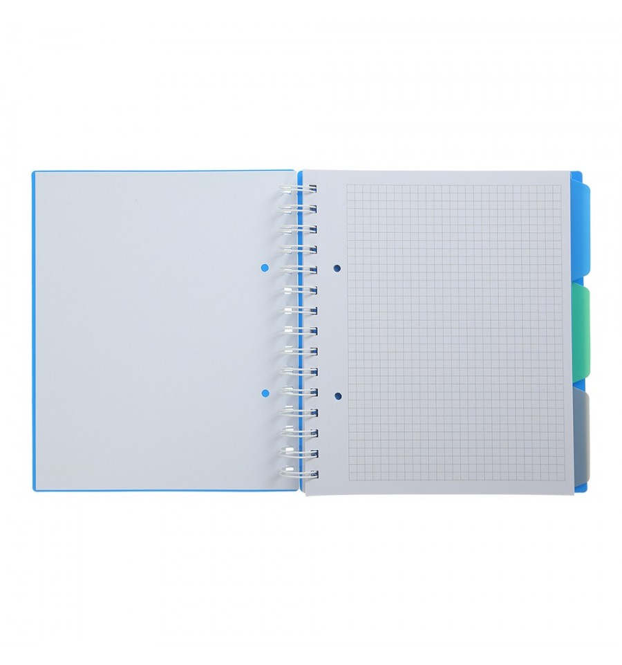 Тетрадь на пружине КЛАССИК- для ведения записей, конспектов, заметок, черновиков, графических зарисовок и т.д. Может использоваться работниками офисов и производств, государственных учреждений, финансовых организаций, учащимися, студентами и преподавателями.120 листов формат мини В5 (170х205 мм) внутренний блок: белая офсетная бумага плотностью 70 г/м² содержит 3 разноцветных пластиковых разделителя внутри внутреннего блока, что позволит удобно систематизировать различные записи в одной тетради. линирование в клеточку материал обложки: жесткий пластик, защищающий записи от намокания, смятия и загрязнения тип скрепления: металлическая пружина сбоку, которая обеспечивает легкое перелистывание листов и комфортное письмо с обеих сторон. имеет микроперфорацию листов для легкого и ровного их отделения. листы внутреннего блока имеют отверстия для подшивки в быстросшиватель. цвет обложки синий