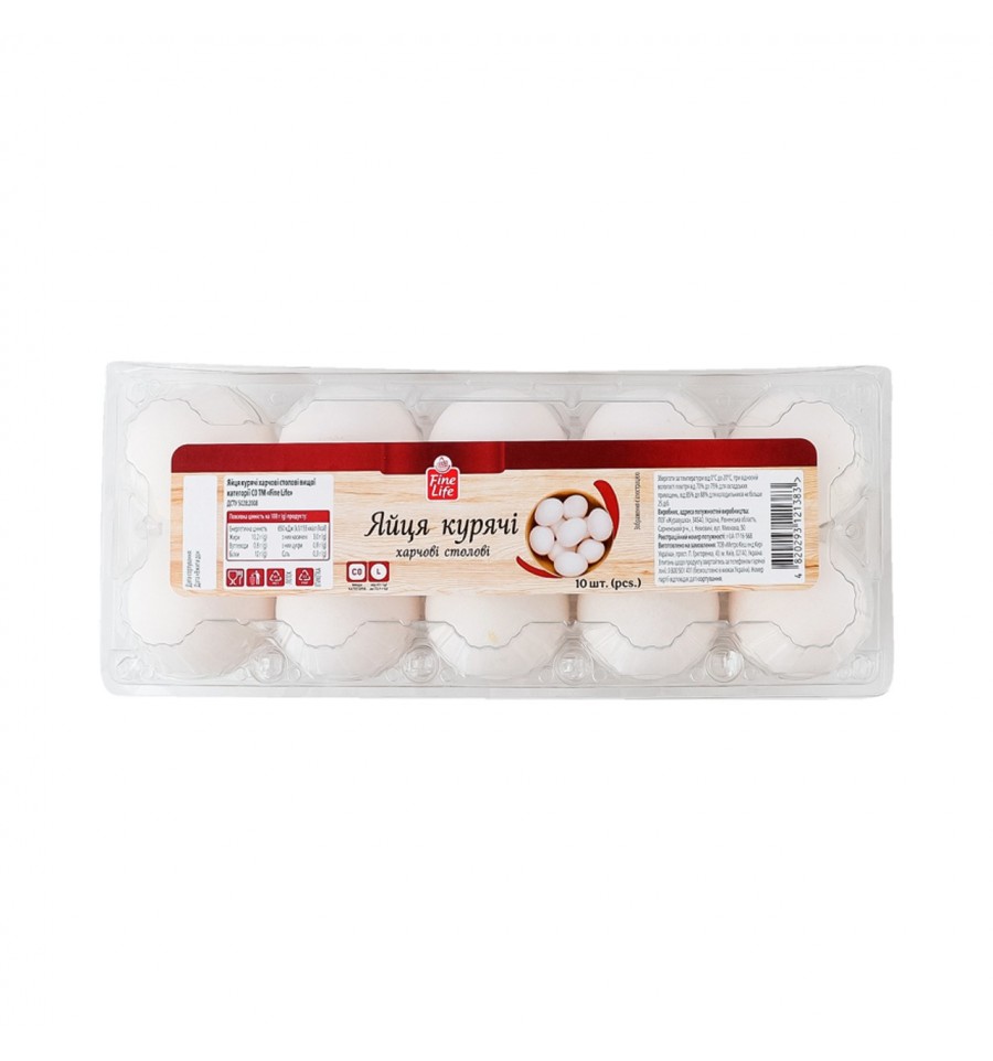 Яйца Fine Life куриные пищевые столовые L С0 10шт/уп. Состав: яйца куриные пищевые столовые высшей категории C0. Энергетическая ценность продукта: 650кДж/100г, 155ккал/100г. Питательная (пищевая) ценность продукта: белки – 12г/100г, жиры – 10.2г/100г, насыщенные жиры – 3г/100г, углеводы – 0.8г/100г, из них сахара – 0.8г/100г, соль – 0.3. Условия хранения: хранить при температуре 0..+20ºC и относительной влажности воздуха 70-75%. Срок годности: 25 дней. Страна изготовитель: Украина. Производственные мощности и адрес производственных мощностей: ПОГ Журавушка, ул. Михновка, 50, с. Немовичи, Сарненский р-н, Ровенская обл., Украина, 34540. Количество: 10шт.