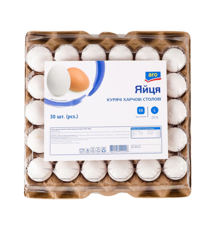 Яйца Aro куриные пищевые столовые L С0 30шт/уп. Состав: яйца куриные пищевые столовые высшей категории C0. Энергетическая ценность продукта: 650кДж/100г, 155ккал/100г. Питательная (пищевая) ценность продукта: белки – 12г/100г, жиры – 10.2г/100г, насыщенные жиры – 3г/100г, углеводы – 0.8г/100г, из них сахара – 0.8г/100г, соль – 0.3. Условия хранения: хранить при температуре 0..+20ºC и относительной влажности воздуха 70-75%. Срок годности: 25 дней. Страна изготовитель: Украина. Производственные мощности и адрес производственных мощностей: ПОГ Журавушка, ул. Михновка, 50, с. Немовичи, Сарненский р-н, Ровенская обл., Украина, 34540. Количество: 30шт.