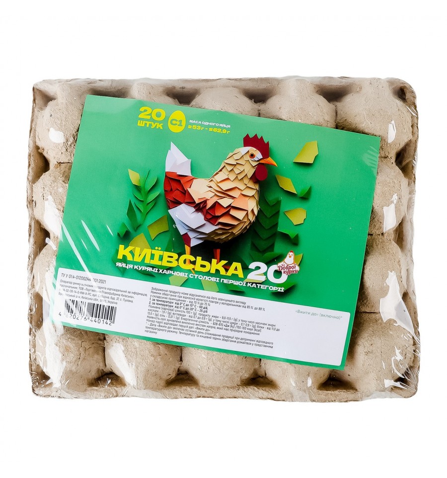 Яйца От хорошей курицы Киевская 20 куриные столовые С1 20шт/уп. Состав: яйца куриные пищевые столовые первой категории. Энергетическая ценность продукта: 628-670кДж/100г, 150-160ккал/100г. Питательная (пищевая) ценность продукта: белки – 11-13г/100г, жиры – 9-11.5г/100г, насыщенные жирные кислоты – 1.9г/100г, углеводы – 0.7-0.9г/100г, из них сахара – 0.7-0. Условия хранения: хранить при температуре 0..+20ºC и относительной влажности воздуха 70-75%. Срок годности: 25 дней. Температура хранения дополнительного срока годности: хранить при температуре 0..+10ºC. Дополнительный срок годности: 60 дней. Страна изготовитель: Украина. Оператор рынка и адрес оператора рынка: ООО Торговая Птицефабрика Киевская, ул. Соборная, дом. 37, с. Пуховка, Броварской р-н, Киевская обл., Украина, 07413. Количество: 20шт.