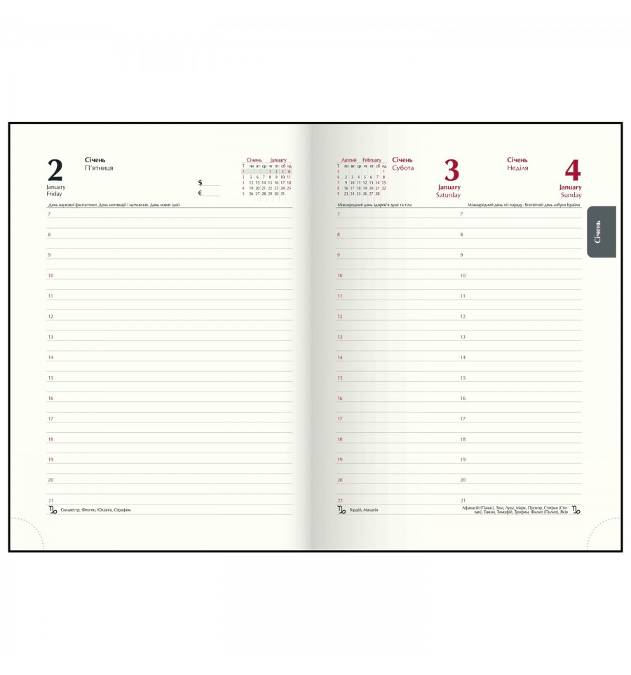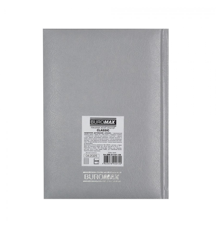 Дневники BUROMAX – это всегда широкий выбор самых разных обложек, фактур, размеров и цветов. Мы найдем подход к сердцу каждого покупателя!Жесткая обложка из бумвинила с поролоном ежедневника CLASSIC выполнена под фактуру натуральной кожи в классическом дизайне с яркими акцентами – тиснение рока и декоративных элементов серебряной фольгой и тонированный серебром срез внутреннего блока.Формат А5 336 страниц Внутренний блок: офсетная бумага кремового цвета плотностью 70 г/м² Закладка-лесое в цвет обложки Перфорированные уголки листов Печать блока в 2 цвета: серый и бордовый Два языка блока: украинский, английский Карты Украины и Европы на форзацах Индивидуальная упаковка: картонная коробка Структура внутреннего блока:Страница для внесения личной информации Календари на 2025 – 2028 годы Планинг на 2026 год Информационно-справочный блок: национальные, религиозные, профессиональные праздники и памятные даты, знаки зодиака, телефонные коды мобильных операторов и областных центров Украины, буквенные автомобильные коды стран, таблица расстояний между областными центрами Украины, справочник систем измерения, международные знаки соответствия, знаки ухода за одеждой Датированная страница на каждый день года с организатором времени от 7:00 до 21:00, календарем на текущий/следующий месяц, обозначением дня недели, знака зодиака, именинников Алфавитная книга для внесения контактов Дневник BUROMAX формата А5 – это выбор, проверенный временем, самый популярный формат для незаменимого помощника в планировании Вашего рабочего дня!