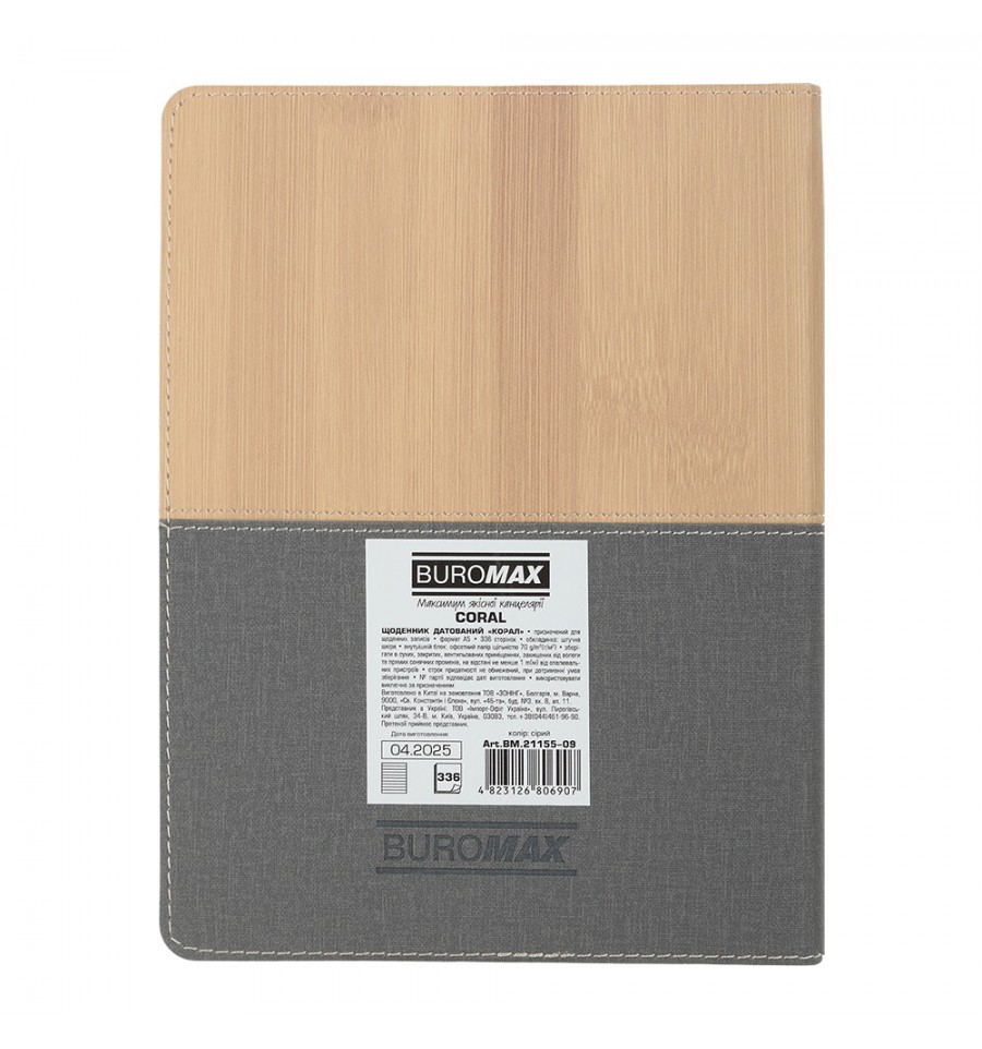 Дневники BUROMAX – это всегда широкий выбор самых разных обложек, фактур, размеров и цветов. Мы найдем подход к сердцу каждого покупателя!Гибкая обложка из искусственной кожи дневника CORAL выполнена в комбинации двух материалов с фактурой типа "бамбуковая доска" и фактурой ткани, украшенная декоративным швом по периметру и на стыке фактур. Гармонично дополняет дизайн слепое тиснение рока на лицевой стороне и тонированный в цвет обложки срез внутреннего блока.Формат А5 336 страниц Внутренний блок: офсетная бумага кремового цвета плотностью 70 г/м² Закладка-лесое в цвет обложки Перфорированные уголки листов Печать блока в 2 цвета: серый и бордовый Два языка блока: украинский, английский Карты Украины и Европы на форзацах Индивидуальная упаковка: картонная коробка Структура внутреннего блока:Страница для внесения личной информации Календари на 2025 – 2028 годы Планинг на 2026 год Информационно-справочный блок: национальные, религиозные, профессиональные праздники и памятные даты, знаки зодиака, телефонные коды мобильных операторов и областных центров Украины, буквенные автомобильные коды стран, таблица расстояний между областными центрами Украины, справочник систем измерения, международные знаки соответствия, знаки ухода за одеждой Датированная страница на каждый день года с организатором времени от 7:00 до 21:00, календарем на текущий/следующий месяц, обозначением дня недели, знака зодиака, именинников Алфавитная книга для внесения контактов Дневник BUROMAX формата А5 – это выбор, проверенный временем, самый популярный формат для незаменимого помощника в планировании Вашего рабочего дня!