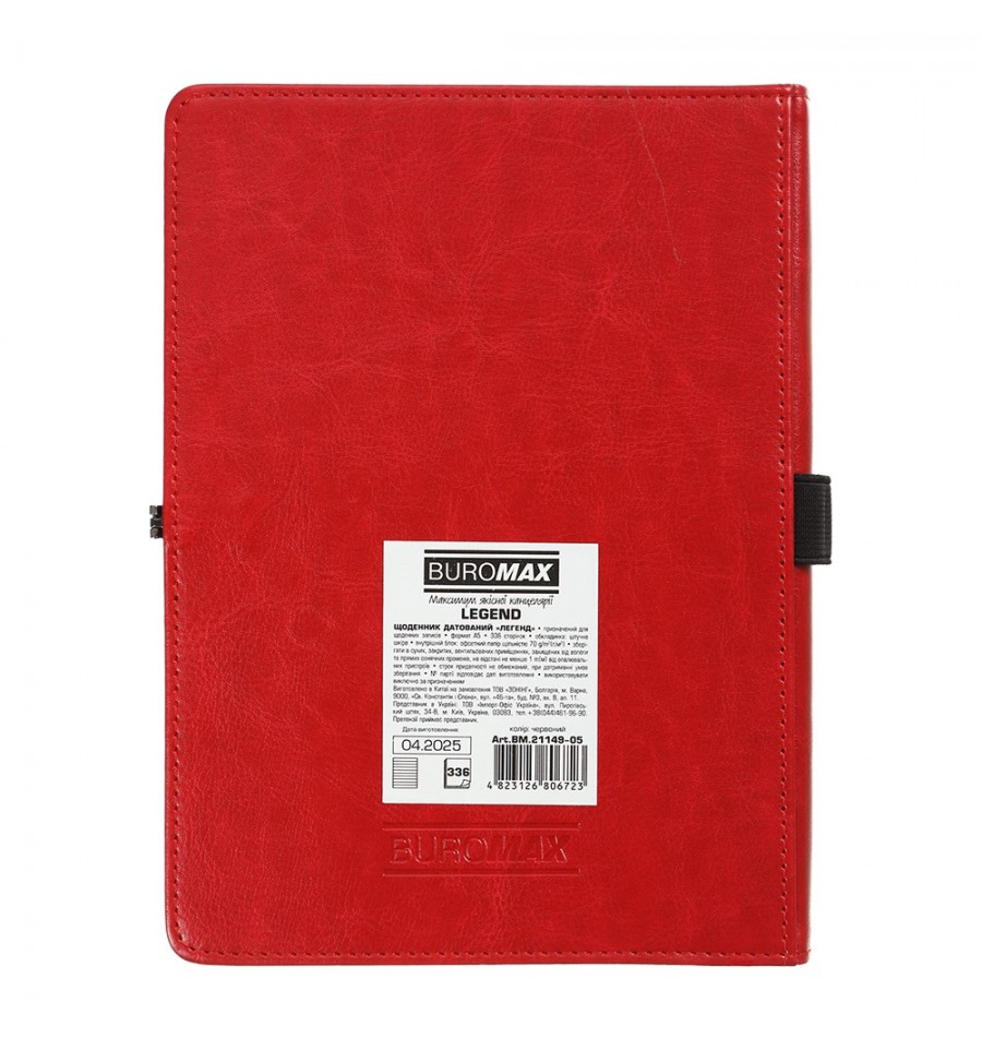 Дневники BUROMAX – это всегда широкий выбор самых разных обложек, фактур, размеров и цветов. Мы найдем подход к сердцу каждого покупателя!Обложка из искусственной кожи дневника LEGEND имеет слепое тиснение года на лицевой стороне и элегантную металлическую магнитную застежку, которая зафиксирует дневник в закрытом положении. По-периметру обложка отделана декоративным швом. Гармонично оттеняет тонированный в черный цвет срез внутреннего блока.Формат А5 336 страниц Внутренний блок: офсетная бумага кремового цвета плотностью 70 г/м² Закладка-лесое в цвет обложки Перфорированные уголки листов Печать блока в 2 цвета: серый и бордовый Два языка блока: украинский, английский Форзацы в цвет обложки Индивидуальная упаковка: картонная коробка Структура внутреннего блока:Страница для внесения личной информации Календари на 2025 – 2028 годы Планинг на 2026 год Информационно-справочный блок: национальные, религиозные, профессиональные праздники и памятные даты, знаки зодиака, телефонные коды мобильных операторов и областных центров Украины, буквенные автомобильные коды стран, таблица расстояний между областными центрами Украины, справочник систем измерения, международные знаки соответствия, знаки ухода за одеждой Датированная страница на каждый день года с организатором времени от 7:00 до 21:00, календарем на текущий/следующий месяц, обозначением дня недели, знака зодиака, именинников Алфавитная книга для внесения контактов Дневник BUROMAX формата А5 – это выбор, проверенный временем, самый популярный формат для незаменимого помощника в планировании Вашего рабочего дня!На этой модели дневника возможно тиснение как слепым методом, так и методом фольгирования.