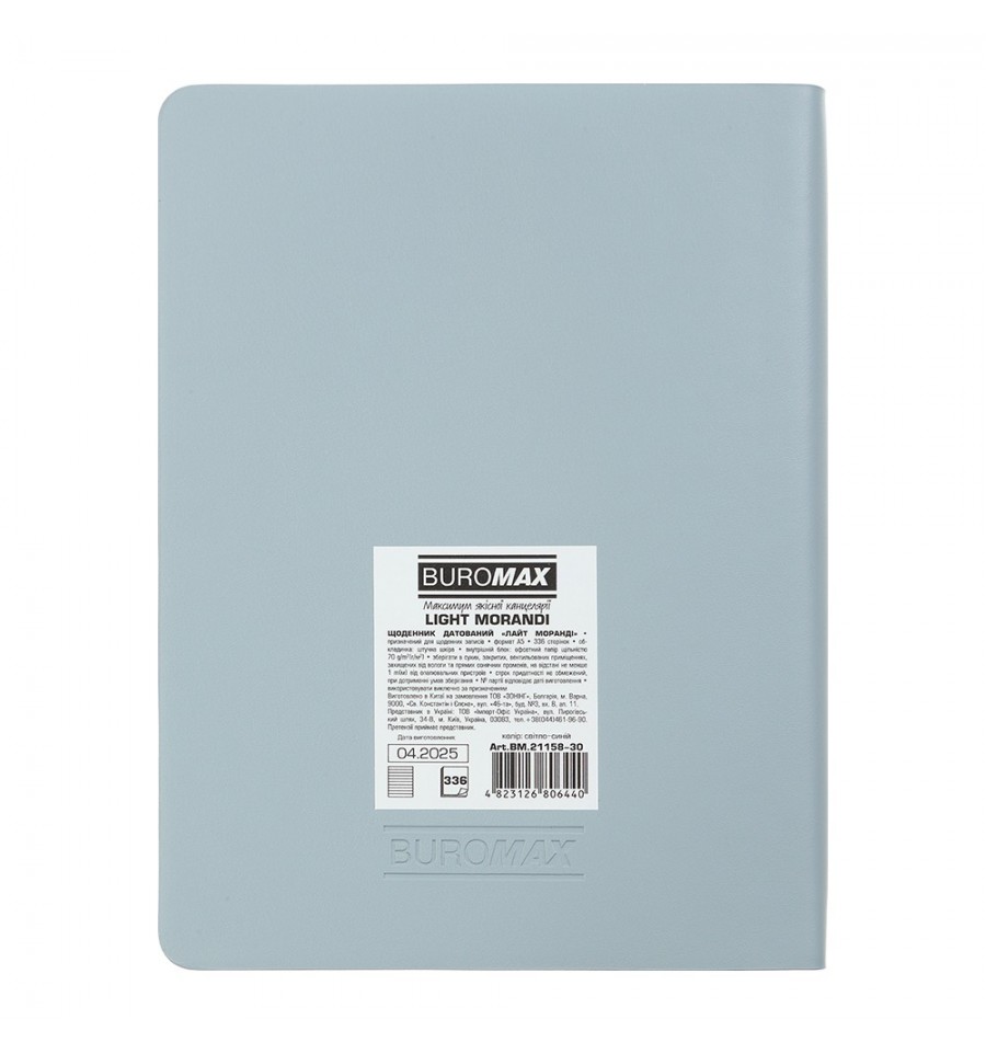 Дневники BUROMAX – это всегда широкий выбор самых разных обложек, фактур, размеров и цветов. Мы найдем подход к сердцу каждого покупателя!Гибкая обложка из искусственной кожи дневника LIGHT MORANDI выполнена из приятного на ощупь материала в легком цвете модной палитры "моранди" и имеет оригинальное слепое тиснение года на лицевой стороне. Гармонично дополняет дизайн тонированный в цвет обложки срез внутреннего блока.Формат А5 336 страниц Внутренний блок: офсетная бумага кремового цвета плотностью 70 г/м² Закладка-лесое в цвет обложки Перфорированные уголки листов Печать блока в 2 цвета: серый и бордовый Два языка блока: украинский, английский Форзацы в цвет обложки Индивидуальная упаковка: картонная коробка Структура внутреннего блока:Страница для внесения личной информации Календари на 2025 – 2028 годы Планинг на 2026 год Информационно-справочный блок: национальные, религиозные, профессиональные праздники и памятные даты, знаки зодиака, телефонные коды мобильных операторов и областных центров Украины, буквенные автомобильные коды стран, таблица расстояний между областными центрами Украины, справочник систем измерения, международные знаки соответствия, знаки ухода за одеждой Датированная страница на каждый день года с организатором времени от 7:00 до 21:00, календарем на текущий/следующий месяц, обозначением дня недели, знака зодиака, именинников Алфавитная книга для внесения контактов Дневник BUROMAX формата А5 – это выбор, проверенный временем, самый популярный формат для незаменимого помощника в планировании Вашего рабочего дня!На этой модели дневника возможно тиснение как слепым методом, так и методом фольгирования.