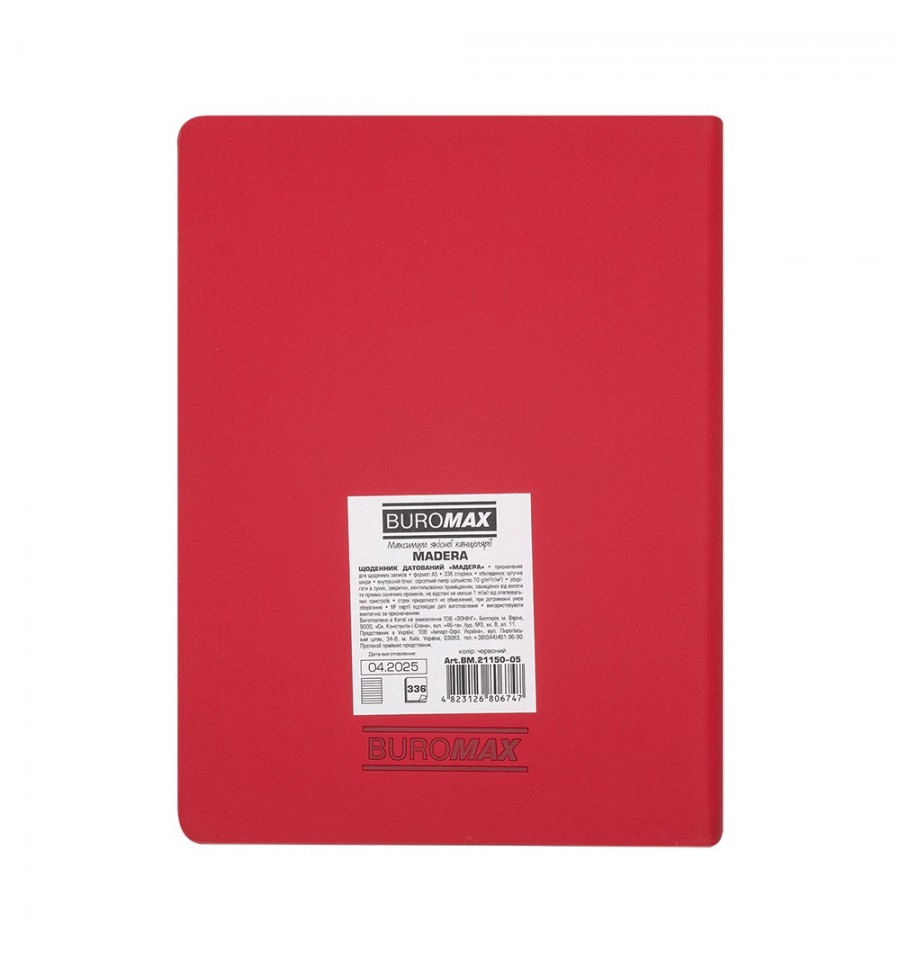 Дневники BUROMAX – это всегда широкий выбор самых разных обложек, фактур, размеров и цветов. Мы найдем подход к сердцу каждого покупателя!Гибкая обложка из искусственной кожи дневника MADERA изготовлена из материала под матовую натуральную кожу, имеет нанесение рока и надпись на лицевой стороне с эффектом "вырезания из кожи". Гармонично дополняет дизайн тонированный в цвет обложки срез внутреннего блока.Формат А5 336 страниц Внутренний блок: офсетная бумага кремового цвета плотностью 70 г/м² Закладка-лесое в цвет обложки Перфорированные уголки листов Печать блока в 2 цвета: серый и бордовый Два языка блока: украинский, английский Форзацы в цвет обложки Индивидуальная упаковка: картонная коробка Структура внутреннего блока:Страница для внесения личной информации Календари на 2025 – 2028 годы Планинг на 2026 год Информационно-справочный блок: национальные, религиозные, профессиональные праздники и памятные даты, знаки зодиака, телефонные коды мобильных операторов и областных центров Украины, буквенные автомобильные коды стран, таблица расстояний между областными центрами Украины, справочник систем измерения, международные знаки соответствия, знаки ухода за одеждой Датированная страница на каждый день года с организатором времени от 7:00 до 21:00, календарем на текущий/следующий месяц, обозначением дня недели, знака зодиака, именинников Алфавитная книга для внесения контактов