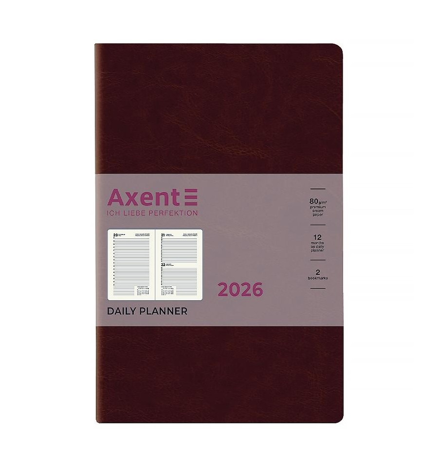 Удобный ежедневник Axent из серии Partner City в мягкой обложке с серебряным срезом. Используется для ежедневных записей, деловых и творческих задач.Мягкая обложка помогает сохранить аккуратный и презентабельный вид в течение длительного времени. Качественная кремовая бумага плотностью 80 г/м2 хорошо впитывает чернила и обеспечивает комфортное письмо. Удобно делать записи, чертить и рисовать. Ежедневник имеет датированный блок в линию на каждый день.Внутренний блок на украинском языке. Дневник содержит календарь на 2026-2027 год, общее недельное расписание, информацию о праздниках, важные номера телефонов, часовые пояса стран мира, единицы измерения, шкалу температур.Две разноцветные закладки-ляссе позволяют быстро найти и открыть нужные страницы. Содержит 168 листов, размер – 145*210 мм. Карманы на форзаце нет. Нет тесьмы на обложке и петли для ручки.