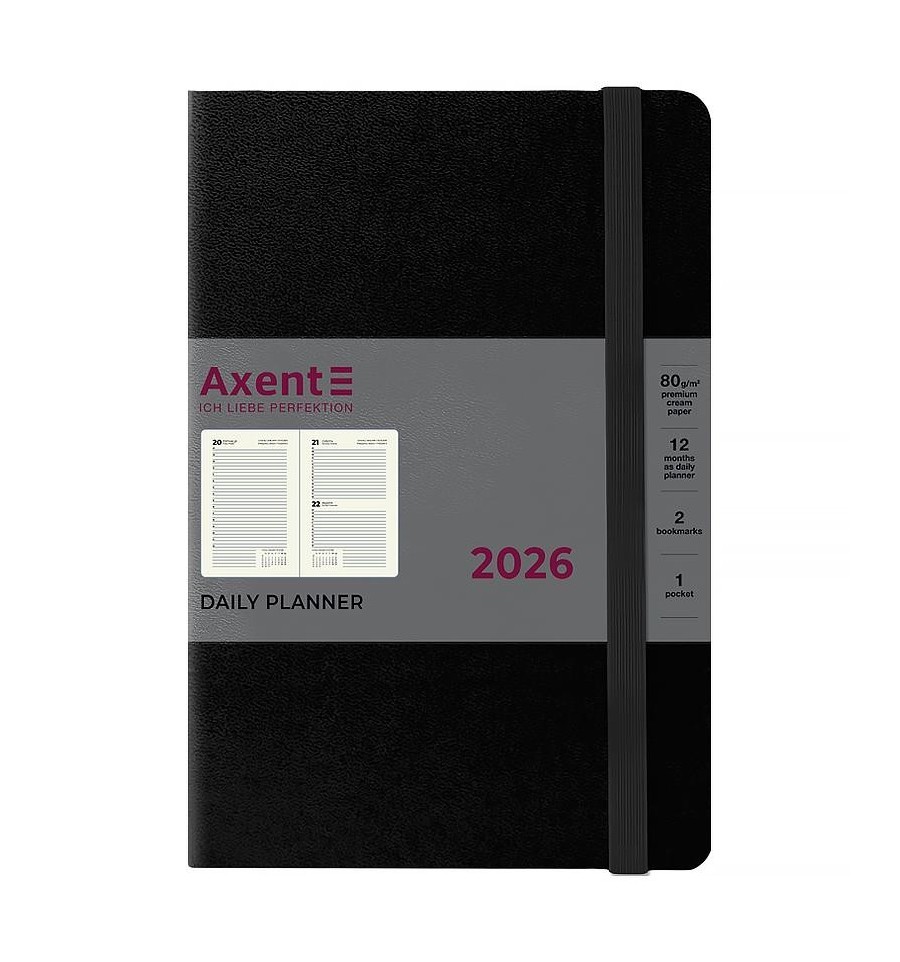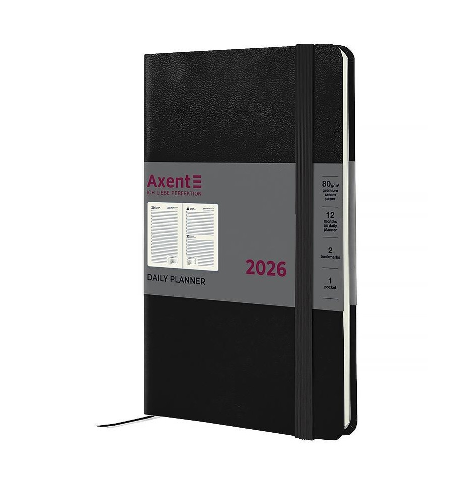 Удобный дневник Axent из серии Partner Strong в жесткой обложке. Используется для ежедневных записей, деловых и творческих задач.Твердый переплет помогает сохранить аккуратный и презентабельный вид в течение длительного времени. Качественная кремовая бумага плотностью 80 г/м2 хорошо впитывает чернила и обеспечивает комфортное письмо. Удобно делать записи, чертить и рисовать. Ежедневник имеет датированный блок в линию на каждый день.Внутренний блок на украинском языке. Дневник содержит календарь на 2026-2027 год, общее недельное расписание, информацию о праздниках, важные номера телефонов, часовые пояса стран мира, единицы измерения, шкалу температур.Две разноцветные закладки-ляссе позволяют быстро найти и открыть нужные страницы. Содержит 168 листов, размер – 145*210 мм. Петли для ручки нет. Карман на форзаце.