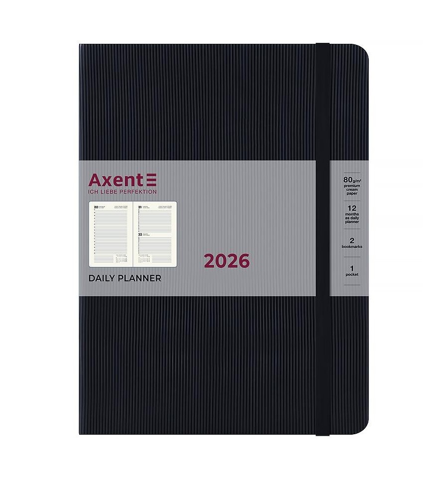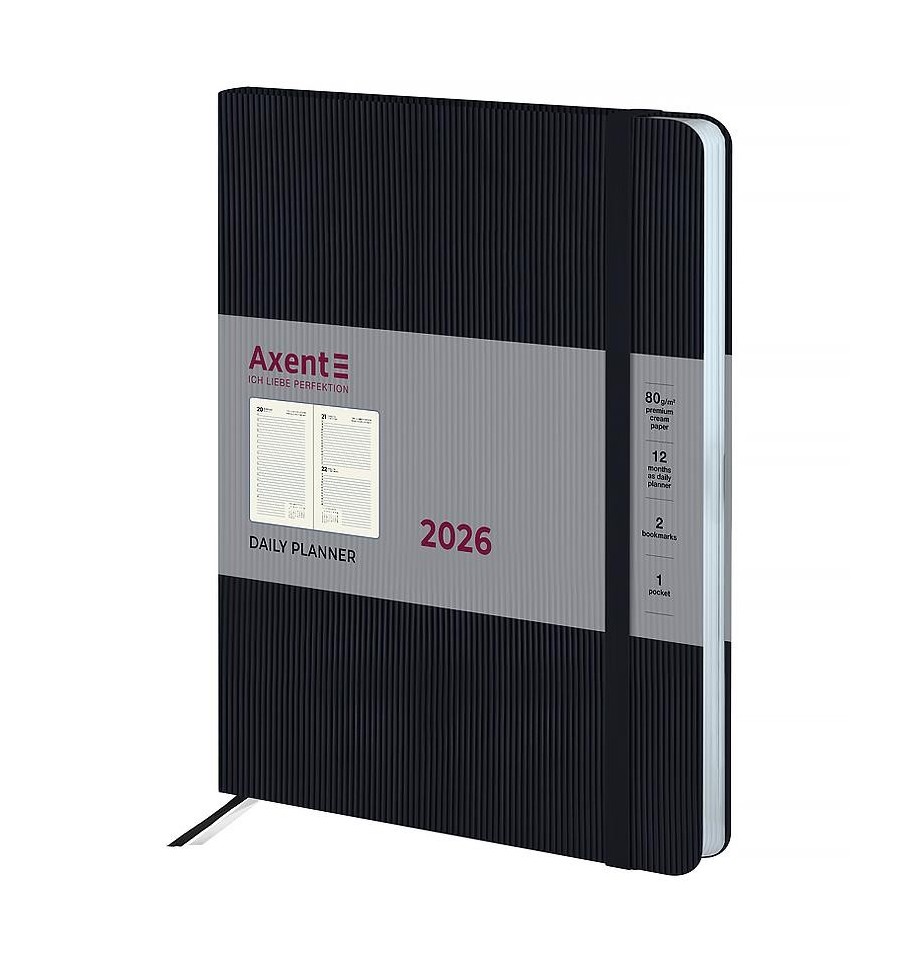 Удобный дневник Axent из серии Partner Lines в твердом переплете. Используется для ежедневных записей, деловых и творческих задач.Твердый переплет помогает сохранить аккуратный и презентабельный вид в течение длительного времени. Качественная кремовая бумага плотностью 80 г/м2 хорошо впитывает чернила и обеспечивает комфортное письмо. Удобно делать записи, чертить и рисовать. Ежедневник имеет датированный блок в линию на каждый день.Внутренний блок на украинском языке. Дневник содержит календарь на 2026-2027 год, общее недельное расписание, информацию о праздниках, важные номера телефонов, часовые пояса стран мира, единицы измерения, шкалу температур.Две разноцветные закладки-ляссе позволяют быстро найти и открыть нужные страницы. Содержит 168 листов, размер – 195*255 мм. Петли для ручки нет. Карман на форзаце.