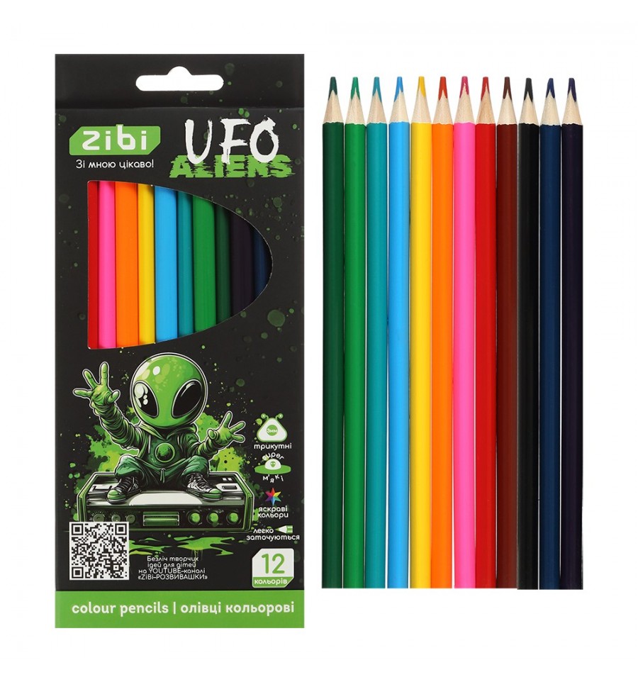 Кольорові супер-м'які олівці серії UFO від ZiBi – це незамінний набір олівців в яскравому сучасному дизайні для кожної дитини, який можна використовувати вдома, у школі, дитячому садочку, а також на різних гуртках та майстер-класах.12 яскравих та насичених кольорів Загострені Ергономічний тригранний корпус з натуральної деревини - рука не втомлюватиметься при малюванні або розмальовуванні навіть великих об'єктів Міцний, ударостійкий і при цьому м'який грифель діаметром 3 мм Легко загостюються, не кришаться і не ламаються Залишають яскраві плавні лінії без пропусків при мінімальній силі натискання Упаковка: картонна коробка з вікном та європідвісом