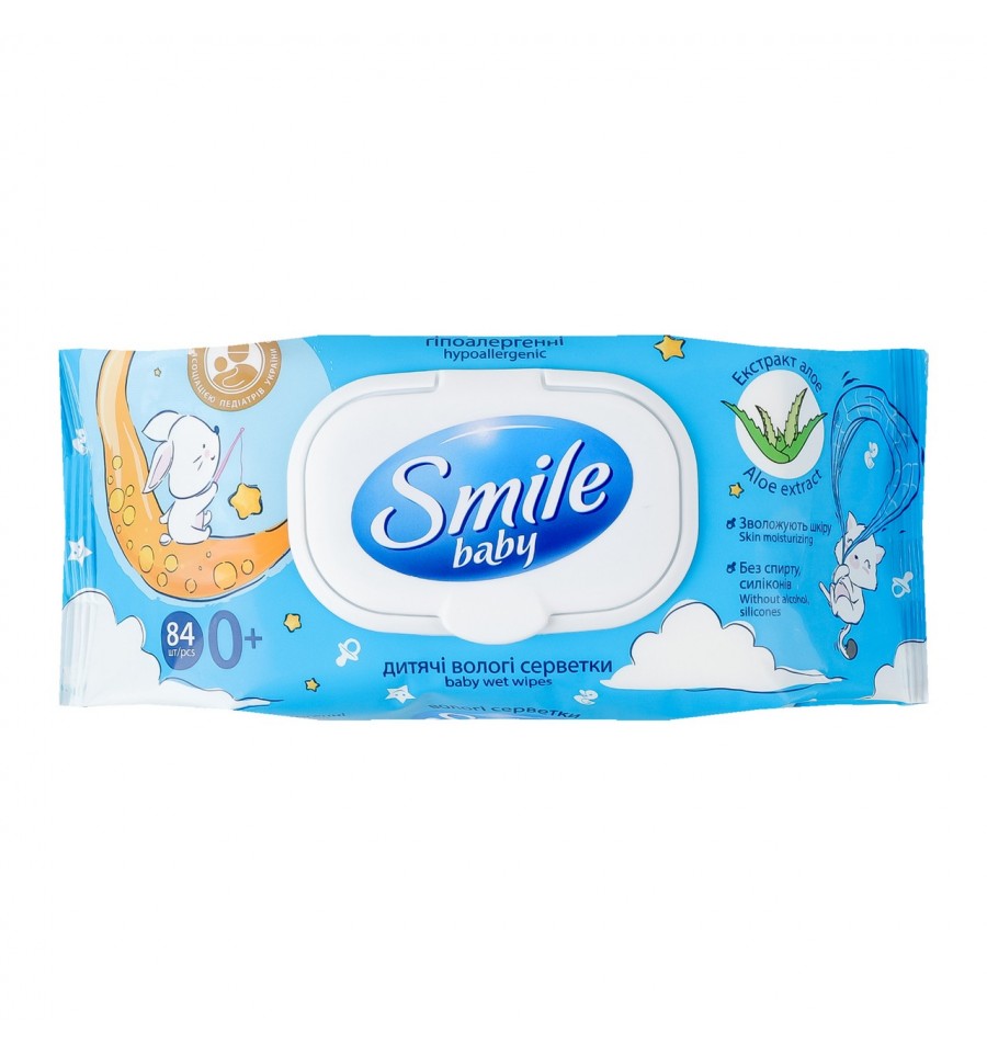 Серветки вологі Smile Baby ультрам`які гіпоалергенні з екстрактом алое для дітей з перших днів життя 84шт/уп. Склад: неткана полотнина, вода демінералізована, гліцерин, екстракт алое, пропіленліколь, ПЕГ-40 гiдрогенізована рицинова олія, кокоглюкозид, 2-бром-2-нітропропан-1,3-дiол, феноксіетанол, кислота лимонна, парфум. Рекомендований спосіб застосування/вживання: відкрити клапан, дістати серветку, клапан щільно закрити, щоб уникнути висихання серветок, обробити шкіру. Умови зберігання: зберігати за температури -20..+30ºC. Без потрапляння прямих сонячних променів. Заходи безпеки: подалі від опалювальних приладів. Термін придатності: 2 роки. Країна виробник: Україна. Виробничі потужності та адреса виробничих потужностей: ТОВ КПД, вул. Теплична, 27, с-ще Слобожанське, Дніпровський р-н, Дніпропетровська обл., Україна, 52005. Кількість: 84шт.