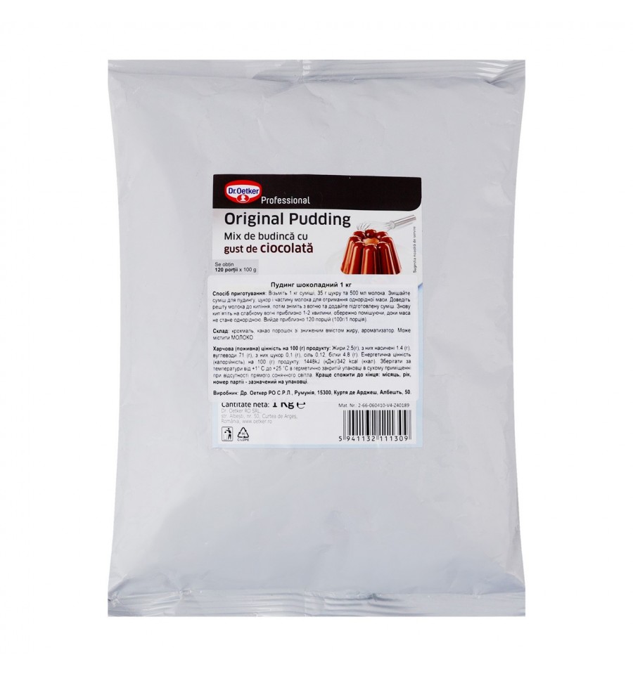 Суміш Dr.Oetker для пудингу зі смаком ванілі 1кг. Склад: кукурудзяний крохмаль, барвник (бета-каротин), ароматизатори, може містити: (молоко). Може містити: МОЛОКО. Енергетична цінність на 100г продукту: 1494 кДж/352 ккал Жири - 0,4 г, Насичені жири - 0,1 г, Вуглеводи - 86 г, Цукри - 0,2 г, Білки - 0,5 г, Сіль - 0,14 г. Термін придатності - 548 днів. Зберігати за температури від +1° С до +25 °С в гериметично закритій упаковці в сухому приміщенні при відсутності прямого сонячного світла. Виробник: ТОВ ДР.ОЕТКЕР. Адреса виробника: Dr. Oetker RO SRL., str. Albesti - 50, Curtea de Agres, Romania. Країна: Румунія. Маса нетто: 1кг.