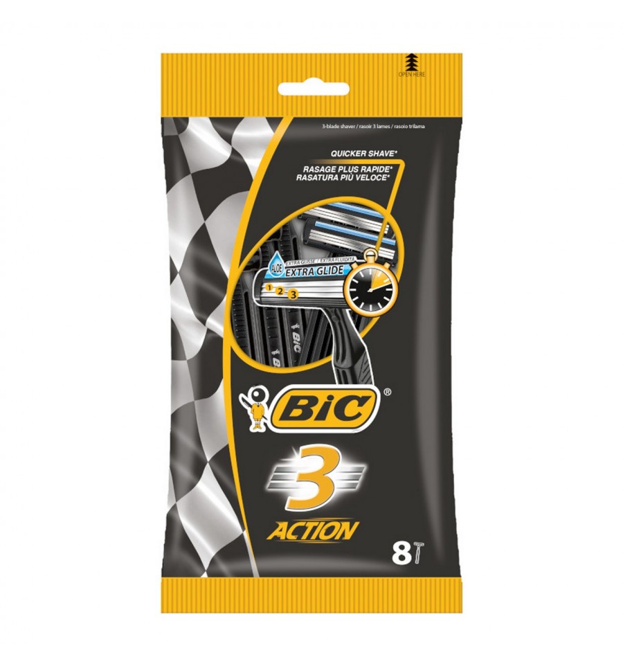 Бритва з 3-ма лезами без змінних картриджів БІК®3 Екшин. Упаковка: 8 штук. Склад: пластик, неіржавна сталь. Строк придатності необмежений. Приготуйтеся до ретельного і швидкого гоління з бритвою BIC 3 Action - бритва з потрійним лезом для чоловіків. Вдосконалена технологія з трьома лезами на фіксованій головці дозволяє отримати прекрасний контроль гоління. Леза для гоління з хромо-полімерним покриттям лишаються гострими довше. Зволожуюча смужка збагачена алое вера забезпечує легше ковзання та швидше гоління (в порівнянні з бритвою BIC 2 Sensitive). Вигнута ручка має ребристу поверхню, котра забезпечує гарний контроль під час гоління. Зберігати в недоступному для дітей місці. Зберігати у сухому місці. Виробник: БІК Віолекс С.А.У. Адреса виробника: 14569, Аніксі, Аттика, вул. Афанассіос. Країна: Греція.
