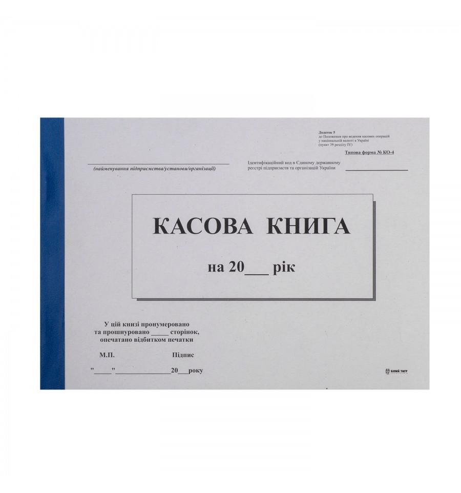 Касова книга, типова форма № КО-4формат А5 орієнтація горизонтальна 100 аркушів обкладинка виготовлена з макулатурного картону щільністю 230 г/м² внутрішній блок виготовлений на самокопіювальному папері щільністю 57 г/м² з'єднання в стачку, проклеєна