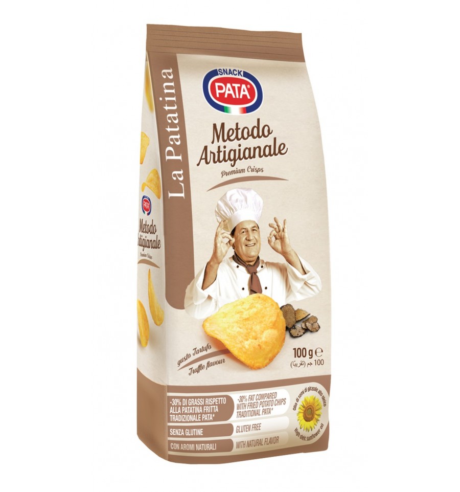Чіпси зі смаком трюфеля. Запаковано в захисному середовищі. Склад: картопля, високоолеїнова соняшникова олія 23%, приправа з трюфелем (сироватка суха (з МОЛОКА), ароматизатори, МОЛОКО сухе, масло вершкове сухе (з МОЛОКА), сіль, перець мелений, зневоднений чорний літній трюфель (Tuber Aestivum Vitt.)), сіль йодована (сіль, калій йодат 0,007%). Без глютену. Поживна цінність на 100 г продукту: енергетична цінність – 1998 кДж / 478 ккал, жири – 23,0 г, з них насичені – 1,9 г, вуглеводи – 58,0 г, з них цукри – 2,1 г, харчові волокна – 5,9 г, білки – 6,7 г, сіль – 1,0 г. Зображення на упаковці є ілюстрацією. Дата “Краще спожити до” вказана на упаковці. Номер партії відповідає даті “Краще спожити до”. Зберігати в сухому прохолодному місці, подалі від джерел тепла. Країна походження: Італія. Імпортер: ТОВ «Метро Кеш енд Кері Україна», просп. П. Григоренка, 43, м. Київ, 02140, Україна, з питань щодо продукту звертайтеся за тел. гарячої лінії імпортера: 0 800 501 401 (безкоштовно в межах України). Маса нетто: 100 g (г)