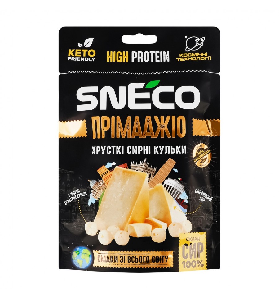Кульки сирні Sneco Прімаджіо хрусткі 20% 28г. Склад: сир (пастеризоване коров`яче молоко, сіль кухонна, чисті бактеріальні культури, мікробіологічний сичужний фермент). Енергетична цінність продукту: 2779кДж/100г, 688ккал/100г. Поживна (харчова) цінність продукту: білки - 53.4г/100г, жири - 42.2г/100г, насичені жири - 29.4г/100г, вуглеводи - 1.5г/100г, сіль - 2.9г/100г. Масова частка жиру в сухій речовині: 20%. Рекомендовані способи застосування/вживання: продукт готовий до вживання. Умови зберігання: зберігати за температури 0..+30ºC і відносній вологості повітря не більше 70%. Темне місце. Термін придатності: 1 рік. Термін придатності після відкриття продукту: 2 дні. Країна виробник: Україна. Виробник та адреса виробника: ТОВ Прайм Снек, вул. Берегівська-бічна, 15, м. Мукачево, Україна, 89600. Адреса виробничих потужностей: вул. Берегівська-бічна, 15, м. Мукачево, Україна, 89600. Маса нетто: 28г.