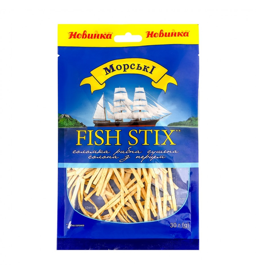 Соломка рибна Морські Fish stix сушена солона з перцем 30г. Склад: путасу сушена 84.98%, крохмаль, сіль кухонна 3%, підсилювач смаку та аромату (натрію глутамат), цукор, червоний перець 1%, консервант (сорбат калію). Без ГМО. Енергетична цінність продукту: 1499кДж/100г, 353ккал/100г. Поживна (харчова) цінність продукту: білки - 23.6г/100г, жири - 1.7г/100г, насичені жири - 1.7г/100г, вуглеводи - 60.9г/100г, з них цукри - 1г/100г, сіль - 3г/100г. Рекомендовані способи застосування/вживання: продукт повністю готовий до споживання без додаткової підготовки. Умови зберігання: зберігати за температури не вищої ніж +25ºC і відносній вологості повітря не більше 75%. Без потрапляння прямих сонячних променів. Термін придатності: 6 місяців. Країна виробник: Україна. Виробник та адреса виробника: ТОВ Снек Продакшн, просп. Олександра Поля, буд. 103, каб. 205, м. Дніпро, Дніпропетровська обл., Україна, 49069. Адреса виробничих потужностей: вул. Миру, 5, м. Синельникове, Дніпропетровська обл., Україна, 52500. Маса нетто: 30г.
