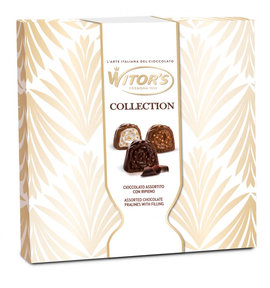 Цукерки асорті праліне з молочного та темного шоколаду з начинкою. Склад: цукор, рослинні жири (кокосовий, пальмоядровий, пальмовий - у змінних пропорціях), какао терте, какао-масло, МОЛОКО сухе незбиране (4,2%), хрусткі злакові кульки (борошно кукурудзяне, борошно рисове, цукор, борошно ПШЕНИЧНЕ, какао-порошок, сироватка МОЛОЧНА суха, сіль), сироватка МОЛОЧНА суха (2,9%), какао-боби карамелізовані мелені (какао-боби мелені, цукор, глюкозний сироп), какао-порошок зі зниженим вмістом жиру, ЛАКТОЗА (0,7%), ЛІСОВИЙ ГОРІХ, емульгатор: СОЄВИЙ лецитин, ароматизатори. Мінімальний вміст какао-продуктів в молочному шоколаді 30%. Мінімальний вміст какао-продуктів в темному шоколаді 50%. Походження какао – країни не ЄС. Енергетична цінність: 2246 кДж / 538 ккал. Жири - 31 г, з них насичені – 21 г, Вуглеводи – 60 г, Цукри – 57 г, Білки – 3,7 г, Сіль – 0,14 г. ПРОДУКТ МОЖЕ МІСТИТИ СЛІДИ ІНШИХ ГОРІХІВ І ЯЄЦЬ. Зберігати в прохолодному сухому місці. Дата “Краще спожити до” та номер партії: вказані на упаковці. Країна походження: Італія. Виробник: Віторс С.П.А. - Віа Левата, 2 – 26010 Корте де Фраті, Італія. Імпортер: ТОВ «Метро Кеш енд Кері Україна», 02140, Україна, м. Київ, Проспект П. Григоренка, буд. 43. З питань щодо продукту звертайтесь за тел. гарячої лінії імпортера 0800501401 (безкоштовно в межах України). Маса нетто: 200 г.