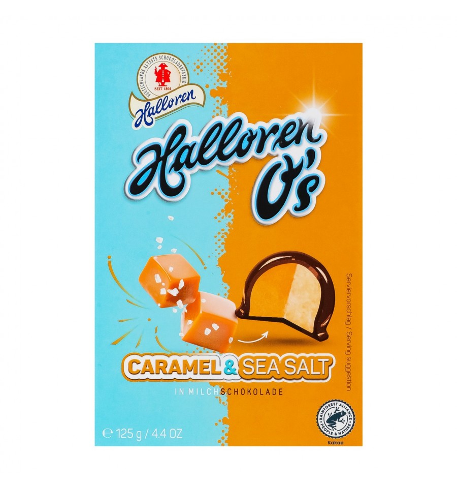 Цукерки «Halloren O´s Caramel Sea Salt» з карамеллю та морською сіллю. Склад: цукор, сухе незбиране МОЛОКО, глюкозний сироп, какао-масло, вода, масло вершкове (з МОЛОКА), карамельна крихта 2,8% (МОЛОКО знежирене, сироватка (з МОЛОКА), цукор, масло вершкове (з МОЛОКА), какао терте, сироватка молочна суха (з МОЛОКА), натуральний ароматизатор, регулятор кислотності: лимонна кислота, морська сіль 0,1%, барвник (концентрати: яблука, моркви, гібіскус, меляса з цукрової тростини), вологоутримуючий агент: інвертаза, емульгатор: лецитини СОЄВИЙ. ПРОДУКТ МОЖЕ МІСТИТИ СЛІДИ ГОРІХІВ, АРАХІСУ, ЯЄЦЬ, ГЛЮТЕНУ. Зображення на пакованні є ілюстрацією. Поживна цінність на 100 g (г) продукту: Енергетична цінність 1895 kJ (кДж) /451 kcal (ккал). Жири 16,0 g (г). з них насичені 11,0 g (г). Вуглеводи 71,0 g (г). з них цукри 67,0 g (г). Білки 5,0 g (г). Сіль 0,28 g (г). Зберігати в прохолодному сухому місці. Краще спожити до: та номер партії вказані на верхній частині упаковки. Країна походження: Німеччина. Виробник: Халорен Шоколаденфабрік АГ, Делічер Штрасе 70, 06112 Хале (Заале), Німеччина. Імпортер: ТОВ «Метро Кеш енд Кері Україна», 02140, Україна, м. Київ, Проспект П. Григоренка, буд. 43. З питань щодо продукту звертайтесь за тел. гарячої лінії імпортера 0800501401 (безкоштовно в межах України). Маса нетто: 125 г.