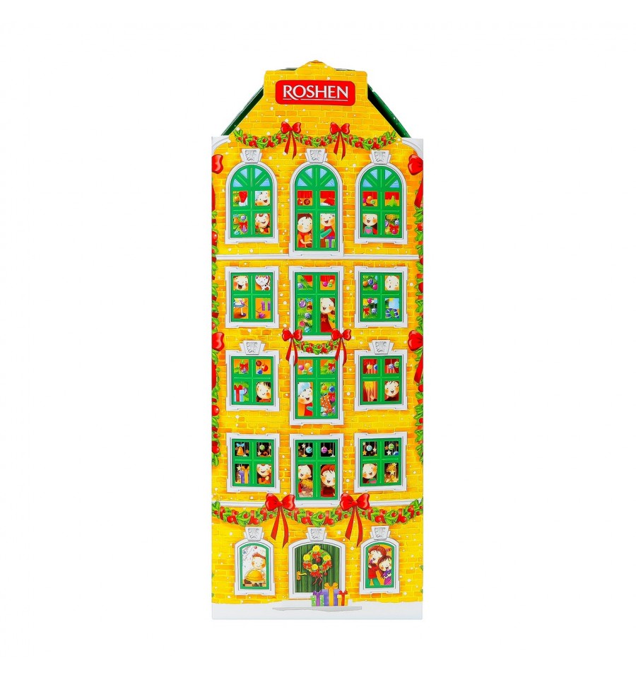 Набір подарунковий Roshen Новорічний будиночок 729г. Склад: цукор, патока, олії рослинні (негідрогенізована пальмова, повністю гідрогенізована пальмоядрова, негідрогенізована пальмоядрова, негідрогенізована ши, негідрогенізована кокосова, негідрогенізована соняшникова), ядра бобів арахісу смажені, какао терте, продукт молоковмісний згущений (молоко знежирене згущене, цукор, негідрогенізована пальмова олія, лактоза), борошно пшеничне, молоко сухе незбиране, какао-масло, молоко сухе знежирене, какао-порошок зі зниженим вмістом жиру, глюкозно-фруктозний сироп, вологоутримуючі агенти (сорбітовий сироп, гліцерин), ядра мигдалю смажені, сироватковий пермеат сухий (з молока), желатин, ядра горіхів фундука смажені, вершки молочні сухі, регулятори кислотності (кислота молочна, кислота лимонна, Е325, Е331), сік яблучний концентрований, меланж яєчний, кокосова стружка смажена, кунжут (сезам) смажений, емульгатори (лецитини (містить сою), Е471, Е472c, Е473, Е476), желюючі агенти (каррагінан, пектин), ароматизатори, жир молочний, кульки кукурудзяні (борошно кукурудзяне, цукор, сіль), сіль, бренді, кульки рисові борошно (рисове, кукурудзяне), цукор, сіль), білок яєчний сухий, глюкоза, барвники (Е100, E132, E150d (містить сульфіти), Е160а, Е160с, Е163), розпушувачі (гідрокарбонат натрію, гідрокарбонат амонію), сік вишневий концентрований, сік апельсиновий концентрований, крохмаль, глазуруючий агент Е901, спирт, суміш емульгуюча (крохмаль пшеничний, сироватка молочна суха, емульгатори (Е475, Е450i), сіль, розпушувач гідрокарбонат натрію), йогурт (з молока), крохмаль модифікований, консервант Е202. Енергетична цінність продукту: 1953кДж/100г, 466ккал/100г. Поживна (харчова) цінність продукту: білки - 5.3г/100г, жири - 19.8г/100г, насичені жири - 10.7г/100г, вуглеводи - 65.4г/100г, з них цукри - 52.7г/100г, сіль - 0.24г/100г. Умови зберігання: зберігати за температури +18 (+/-3)ºC і відносній вологості повітря не більше 75%. Термін придатності: 1 рік. Країна виробник: Україна. Виробник та адреса виробника: ДП КК Рошен, просп. Науки, 1, κορп. 1, м. Київ, Україна, 03039. Маса нетто: 729г.