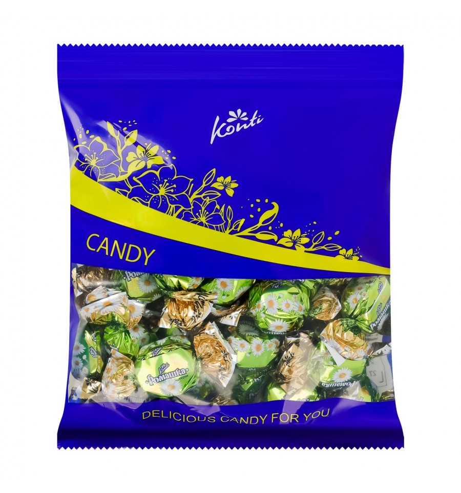 Цукерки Konti Ромашка 500г. Склад: цукор, жир рослинний негідрогенізований (олія пальмова та її фракції, емульгатори Е492, Е322), замінник какао-масла нетемперований лауринового типу (гідрогенізоване пальмове масло, емульгатори: Е492, Е322), патока крохмальна кукурудзяна, сироватка суха молочна, какао зі зниженим вмістом жиру (містить 10-12% какао-масла), коньяк, емульгатори: Е476, лецитин соєвий, ароматизатори, стабілізатор фермент інвертаза. Енергетична цінність продукту: 1810кДж/100г, 430ккал/100г. Поживна (харчова) цінність продукту: білки - 2г/100г, жири - 15г/100г, насичені жири - 11г/100г, вуглеводи - 72г/100г, з них цукри - 71.8г/100г, сіль - 0.02г/100г. Умови зберігання: зберігати за температури +18 (+/-3)ºC і відносній вологості повітря не більше 75%. Термін придатності: 9 місяців. Країна виробник: Україна. Виробник та адреса виробника: ТОВ УК, вул. Енергетиків, 126, м. Канів, Черкаська обл., Україна, 19003. Адреса виробничих потужностей: вул. Енергетиків, 126, м. Канів, Черкаська обл., Україна, 19003. Маса нетто: 500г.