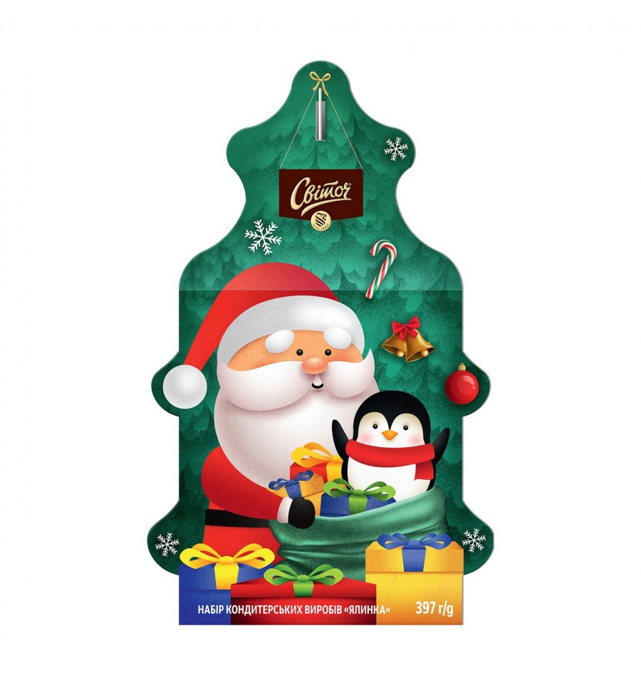 Набір кондитерських виробів Світоч Ялинка 397г. Склад: цукор, рослинні жири (олія пальмова, олія ши, олія пальмоядрова), борошно пшеничне (містить глютен), сироватка молочна суха, какао-порошок зі зниженим вмістом жиру, глюкозно-фруктозний сироп, арахіс, глюкозний сироп, молоко сухе незбиране, какао терте, крупа екструзійна манна (містить глютен), пшеничні пластівці (борошно пшеничне (містить глютен), цукор, крохмаль пшеничний (містить глютен), карамелізований цукровий сироп, сіль кухонна, емульгатор (лецитини), розпушувач (сода харчова)), крохмаль, емульгатори (лецитини, Е476), коньяк, какао-масло, крохмаль пшеничний (містить глютен), мальтодекстрин, молоко сухе знежирене, сіль кухонна, мигдаль, ароматизатори, розпушувач (сода харчова), молочний жир, кориця, поліпшувач борошна (сульфат кальцію), кислота (лимонна кислота). Енергетична цінність продукту: 2078кДж/100г, 496ккал/100г. Поживна (харчова) цінність продукту: білки - 4.5г/100г, жири - 24г/100г, насичені жири - 12г/100г, вуглеводи - 65г/100г, сіль - 0.18г/100г. Умови зберігання: зберігати за температури +6..+30ºC. Термін придатності: 150 днів. Країна виробник: Україна. Виробничі потужності та адреса виробничих потужностей: ПАТ Львівська кондитерська фабрика Світоч, вул. Ткацька, 10, м. Львів, Україна, 79019. Маса нетто: 397г.