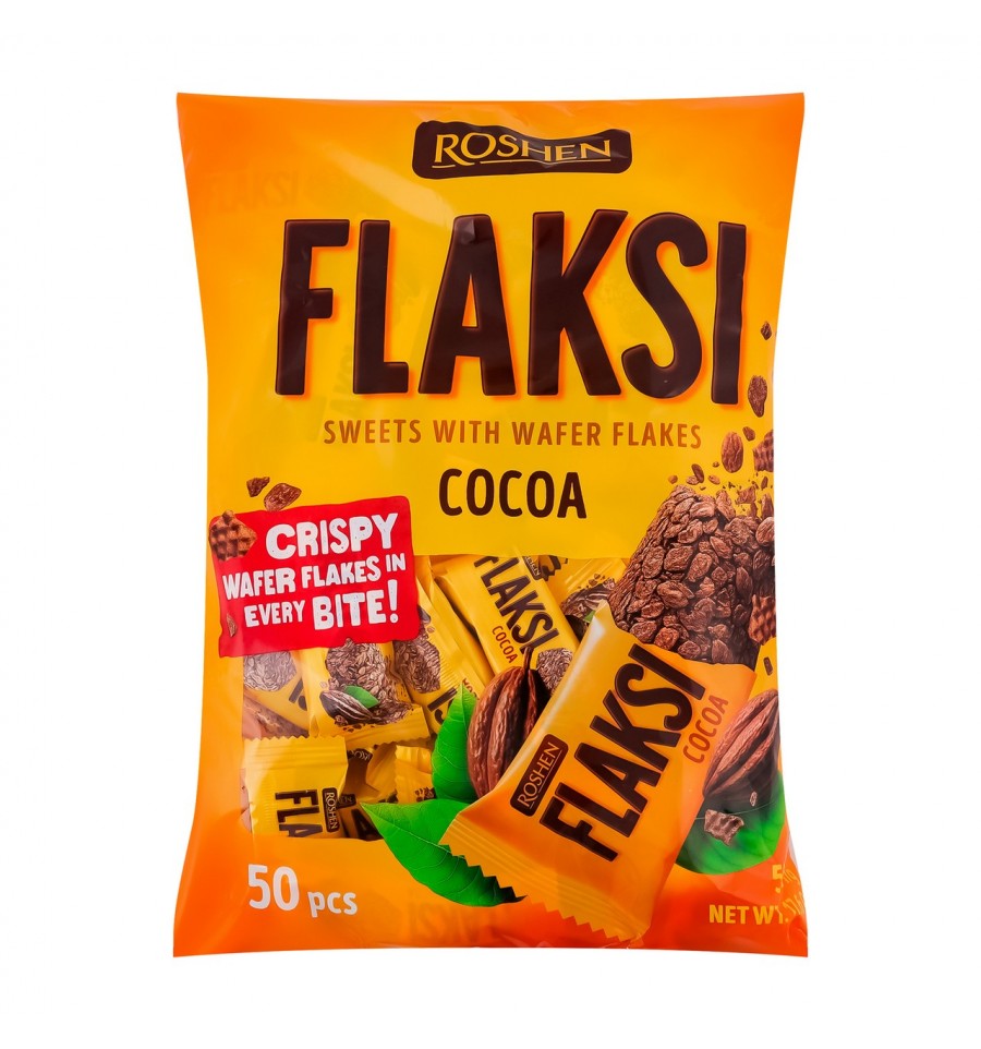 Цукерки Roshen Flaksi Какао з вафельними пластівцями 500г. Склад: цукор, борошно пшеничне, повністю гідрогенізована пальмоядрова олія, молоко сухе знежирене, какао-порошок зі зниженим вмістом жиру 4%, сироватковий пермеат сухий (з молока), олія кокосова, емульгатори лецитини (містить сою), ароматизатори. Вафельні пластівці - 43%. Енергетична цінність продукту: 2022кДж/100г, 482ккал/100г. Поживна (харчова) цінність продукту: білки - 5.7г/100г, жири - 19.4г/100г, насичені жири - 18.2г/100г, вуглеводи - 69.8г/100г, з них цукри - 50.6г/100г, сіль - 0.1г/100г. Умови зберігання: зберігати за температури +18 (+/-3)ºC і відносній вологості повітря не більше 75%. Термін придатності: 1 рік. Країна виробник: Україна. Виробник та адреса виробника: ПрАТ Київська кондитерська фабрика Рошен, просп. Науки, 1, м. Київ, Україна, 03039. Адреса виробничих потужностей: вул. Привокзальна, 82, м. Бориспіль, Київська обл., Україна, 08304. Кількість: 50шт. Маса нетто: 500г.