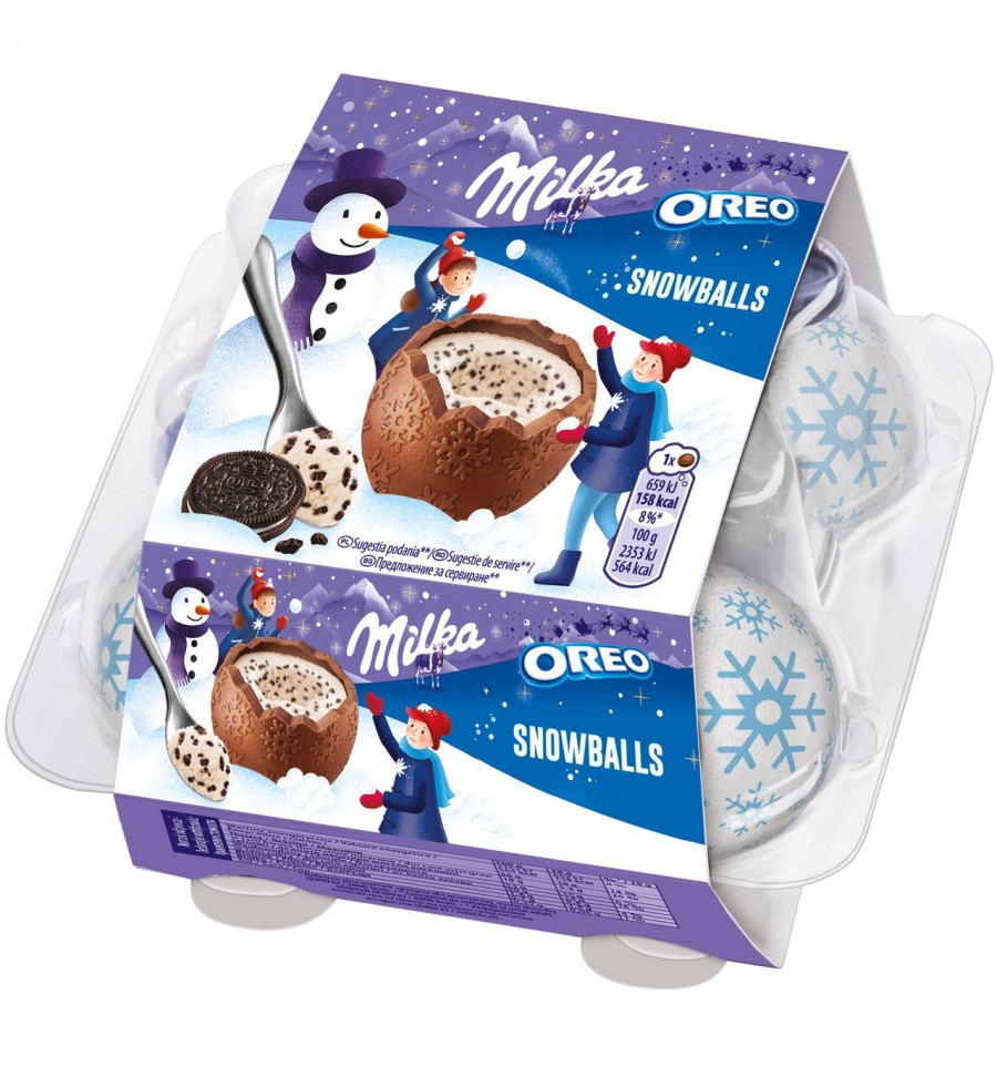 Шоколад Milka Snow balls фігурний молочний з кремовою молочною начинкою і шматочками печива Орео 4*28г/уп. Склад: цукор, рослинні жири (пальмова, пальмоядрова), молоко сухе знежирене, какао-масло, какао терте, сироватка суха молочна, жир молочний, борошно пшеничне, емульгатори (лецитин соєвий, Е475), какао-порошок зі зниженим вмістом жиру (0.2%), горіхова паста (фундук), сироп глюкозно-фруктозний, крохмаль пшеничний, розпушувачі (Е503, Е501, Е500), ароматизатори, сіль, регулятор кислотності (Е524). Енергетична цінність продукту: 2353кДж/100г, 564ккал/100г. Поживна (харчова) цінність продукту: білки - 6.7г/100г, жири - 36г/100г, насичені жири - 18г/100г, вуглеводи - 53г/100г, з них цукри - 50г/100г, сіль - 0.29г/100г. Умови зберігання: сухе місце. Термін придатності: 214 днів. Країна виробник: Сполучене Королівство. Виробничі потужності та адреса виробничих потужностей: Magna Specialist Confectioners Ltd., Стеффорд Парк, 3, Телфорд, Велика Британія, TF3 3ВH. Імпортер та адреса імпортера: ПАТ Монделіс Україна, вул. Набережна, 28А, м. Тростянець, Сумська обл., Україна, 42600. Кількість: 4шт. Маса нетто: 112г.
