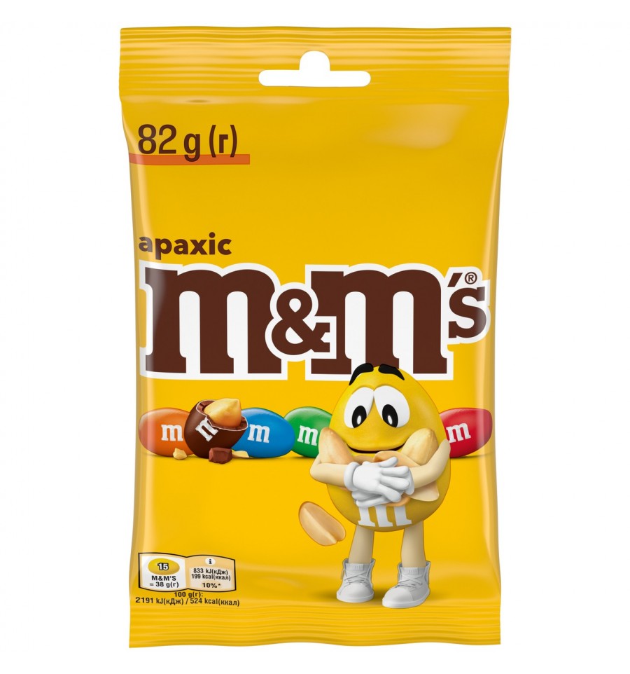 Драже M&M`s з арахісом та молочним шоколадом вкриті різнокольоровою цукровою глазур`ю 82г. Склад: молочний шоколад (48%): цукор, какао терте, молоко сухе незбиране, какао-масло, жири рослинні (пальмовий, ши), сухе знежирене молоко, емульгатор (соєвий лецитин), молочний перміат, молочний жир, сіль, ароматизатор, смажений арахіс (24%): арахіс, цукор, рослинний жир (пальмовий), різнокольорова цукрова глазур (28%): цукор, крохмаль, глюкозний сироп, стабілізатор (Е414), загущувач (Е1400), глазуруючий агент (віск карнаубський), рослинний жир (пальмоядрова олія), харчові барвники (Е120, E133, E170, E100, Е160а, Е160е). Без ГМО. Енергетична цінність продукту: 2191кДж/100г, 524ккал/100г. Поживна (харчова) цінність продукту: білки - 9.7г/100г, жири - 26г/100г, насичені жири - 10г/100г, вуглеводи - 60г/100г, з них цукри - 53г/100г, сіль - 0.11г/100г. Умови зберігання: зберігати за температури +5..+22ºC і відносній вологості повітря не більше 70%. Термін придатності: 217 днів. Країна виробник: Франція. Виробник: Mars Wrigley Confectionery France SAS. Адреса виробничих потужностей: 3, Шемін де ла Сандлаш, м. Агено, Франція, 67 501. Імпортер та адреса імпортера: ТОВ Марс Україна, вул. Онікієнка Олега, 127, м. Бровари, Київська обл., Україна, 07400. Маса нетто: 82г.