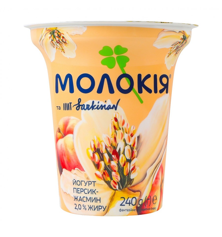 Йогурт Молокія Персик-жасмин з наповнювачем фруктовим пастеризованим 2% 240г. Склад: молоко коров`яче нормалізоване, наповнювач фруктовий пастеризований Персик-Жасмин - 15% (цукор білий кристалічний, персик (25%), вода питна, крохмаль кукурудзяний, концентрований морквяний сік, натуральні ароматизатори маракуї та персику, екстракт жасмину (0.1%), натуральний ароматизатор жасмин, лимонний сік концентрований), ферментний препарат, закваска для йогурту (Streptococcus thermophilus, Lactocillus delbrueckii підвид bugaricus). Енергетична цінність продукту: 353кДж/100г, 84ккал/100г. Поживна (харчова) цінність продукту: білки - 3.4г/100г, жири - 2г/100г, насичені жири - 1.2г/100г, вуглеводи - 13г/100г, з них цукри - 13г/100г, сіль - 0.1г/100г. Масова частка жиру: 2%. Рекомендовані способи застосування/вживання: перед вживанням перемішати. Умови зберігання: зберігати за температури 0..+6ºC. Застереження/міри безпеки: може містити тверді частинки кісточок. Термін придатності: 28 днів. Країна виробник: Україна. Виробник: ПрАТ Тернопільський молокозавод. Адреса виробничих потужностей: вул. Лозовецька, 28, м. Тернопіль, Україна, 46010. Маса нетто: 240г.