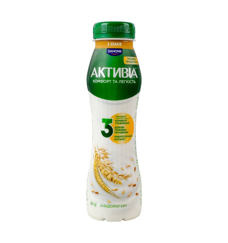 Біфідойогурт Активіа 5 злаків питний з біфідобактеріями Actiregularis 1.2% 260г. Склад: молоко нормалізоване, наповнювач 5 злаків 8% (вода питна, цукор, суміш пластівців зернових культур 5% (пшениця, ячмінь, жито, овес, спельта), насіння льону 3%, загущувачі: крохмаль, пектини, висівки пшеничні 1%, ароматизатор бісквіта, цитрат кальцію, сироп цукровий карамелізований, регулятор кислотності: кислота лимонна), цукор, молоко сухе знежирене, загущувач крохмаль, закваски бактеріальні, пробіотик ActiRegularis. Без ГМО. Енергетична цінність продукту: 272кДж/100г, 65ккал/100г. Поживна (харчова) цінність продукту: білки - 3.2г/100г, жири - 1.3г/100г, насичені жири - 0.7г/100г, вуглеводи - 10.1г/100г, з них цукри - 9.7г/100г, сіль - 0.09г/100г. Масова частка жиру: 1.2%. Мінералізація: кальцій (Ca) - 120мг/100г. Рекомендований спосіб приготування/вживання: рекомендовано перед споживанням збовтати. Умови зберігання: зберігати за температури +4 (+/-2)ºC. Термін придатності: 27 днів. Країна виробник: Україна. Виробник та адреса виробника: ПрАТ Данон Кремез, вул. Лікаря О. Богаєвського, 14/69, м. Кременчук, Полтавська обл., Україна, 39600. Маса нетто: 260г.
