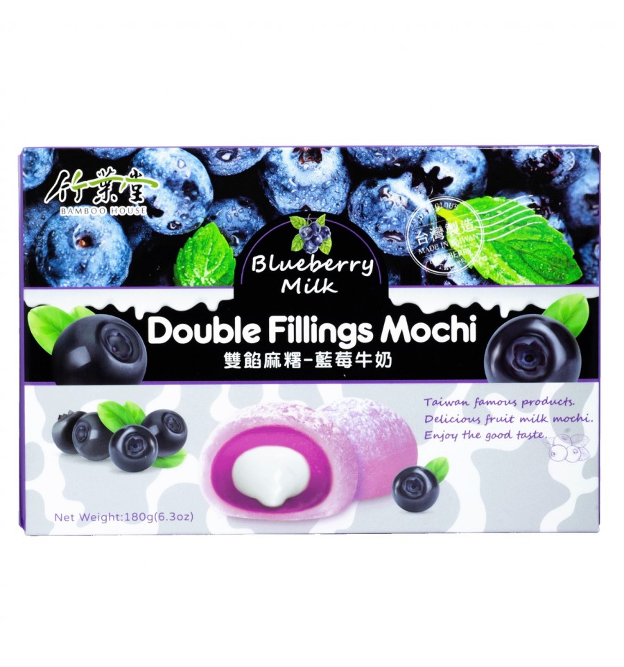 Рисовий десерт «Bamboo House» Мочі з молочно-чорничною начинкою,180g (г). Склад: мальтоза,чорнична паста (чорниця,мальтоза,цукор,пальмова олія),клейкий рис порошок,цукор,пальмова олія,молочна паста (мальтоза,яєчний білок,цукор,пальмова олія,молоко порошок). Гідроксипропілен-крохмалю фосфат (e1442),сорбіт (e420),харчові барвники червоний №40 (e129),синій №1 (e133)),ароматизатор,сорбат калію (консервант,e202.Енергетична цінність (калорійність) на 100г продукту: 1390 кДж / 332 ккал. Поживна (харчова) цінність на 100 г продукту: жири - 2.1г,вуглеводи - 77.7г,білки - 0.5 г. Маса нетто 180g(г).Кінцева дата споживання «Вжити до» та номер партії: зазначені на упаковці. Зберігати в сухому,прохолодному місці,подалі від прямих сонячних променів. У цій коробці знаходиться пакет з поглиначем кисню він небезпечний - не відкривайте і не їжте його. Зберігати в недоступному для дітей місці. Може містити залишки горіхів та молочних продуктів. Після відкриття якнайшвидше закінчити його,щоб уникнути псування. Щоб уникнути удушення,цей продукт необхідно ретельно пережовувати перед ковтанням.Для дітей або людей похилого віку,будь ласка,розрізати на невеликі шматочки перед вживанням. Не їжте під час гри. Зберігати в недоступному для дітей місці. Виробник: BAMBOO HOUSE FOOD CO.,LTD. No.2,Gongye 2nd Rd.,Pingzhen Dist.,Taoyuan City 324,Тайвань.Телефон: 886-3-4195887. Імпортер /Дистриб`ютор в Україні: ТОВ «Стабовіта вул. Центральна,2-В,08320 с. Мала Олександрівка,Бориспільський р-н,Київська обл.Україна. Тел: (044) 391-23-79