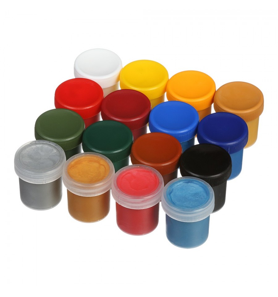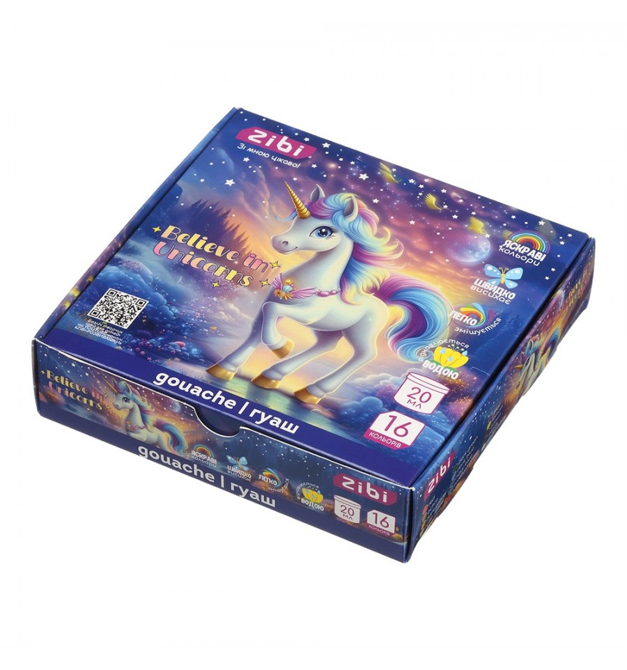 Гуаш серії UNICORN від ZiBi – це фарби для малювання на папері, картоні та дереві. Набір гуашевих фарб можна використовувати для занять у садочку, школі, художніх студіях та гуртках. Малювання такими фарбами чудово розвиває дрібну моторику, фантазію та творчий потенціал у дітей.16 кольорів (12 чистих насичених кольорів + 4 кольори з блиском, включно із золотим та срібним) об’єм фарби одного кольору в баночці 20 мл класичний рецепт непрозорі, перекривають попередні шари мають добру покривну здатність та насичений однорідний колір після нанесення швидко висихають, набуваючи матової поверхні кольори зміщуються між собою, утворюючи нові відтінки відновлюються методом перемішування та додаванням води упаковка: коробка з щільного ламінованого картону