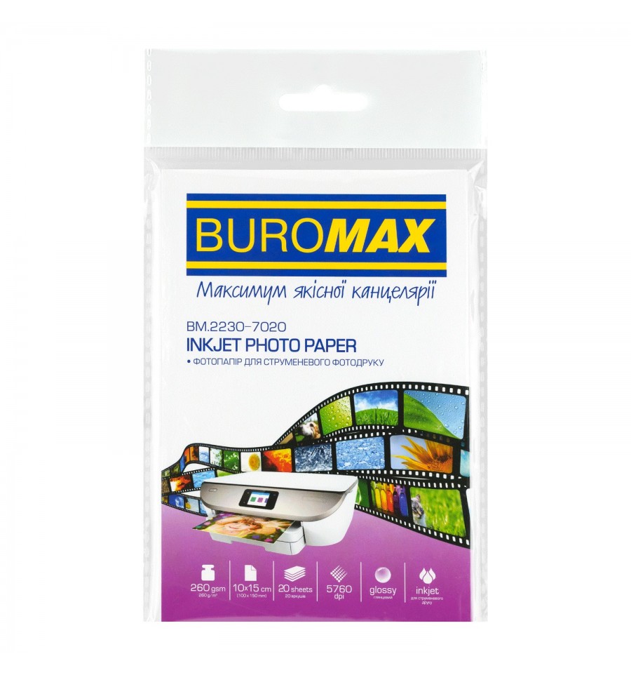 Глянцевий фотопапір від BUROMAX призначений для струменевого фотодруку в межах повсякденних фотопроєктів, для створення професійних та аматорських зображень. Може використовуватися широким колом користувачів, зокрема офісними працівниками, друкарнями, фотолабораторіями та домашніми користувачами для друку фотографій.• глянцева поверхня – дозволяє передавати тонкі градації кольорів та їх відтінків, забезпечує більшу насиченість зображення та кращий захист знімків від вологи • підходить для принтерів з розподільчою здатністю друку до 5760 dpi • швидко висихає, що дозволяє оперативно працювати зі знімкамиТехнічні характеристики • розмір 10х15 см • кількість аркушів – 20 • щільність, г/м² – 260 • білизна паперу (ISO) – 95%• непрозорість паперу - (95-100)% • тип паперу – глянцевий • тип друку – струменевийСклад папір