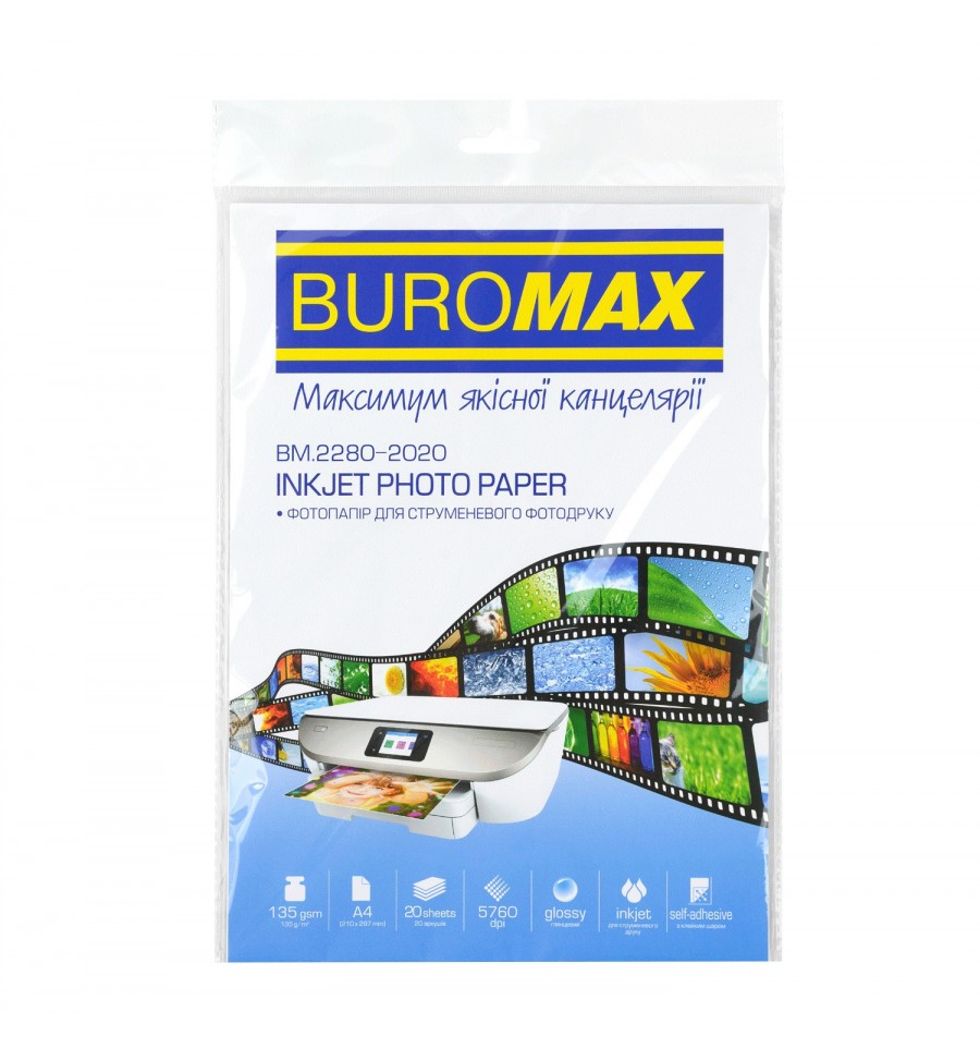 Глянцевий фотопапір від BUROMAX призначений для струменевого фотодруку в межах повсякденних фотопроєктів, для створення професійних та аматорських зображень. Може використовуватися широким колом користувачів, зокрема офісними працівниками, друкарнями, фотолабораторіями та домашніми користувачами для друку фотографій.• глянцева поверхня – дозволяє передавати тонкі градації кольорів та їх відтінків, забезпечує більшу насиченість зображення та кращий захист знімків від вологи • підходить для принтерів з розподільчою здатністю друку до 5760 dpi • швидко висихає, що дозволяє оперативно працювати зі знімками• має клейкий шар на звороті (захищений паперовим лайнером), зображення легко та зручно клеїти на рівні гладкі поверхніТехнічні характеристики • формат А4 • кількість аркушів – 20 • щільність, г/м² – 135 • білизна паперу (ISO) – 95%• непрозорість паперу - (95-100)% • тип паперу – глянцевий • тип друку – струменевийСклад папір, термоклей