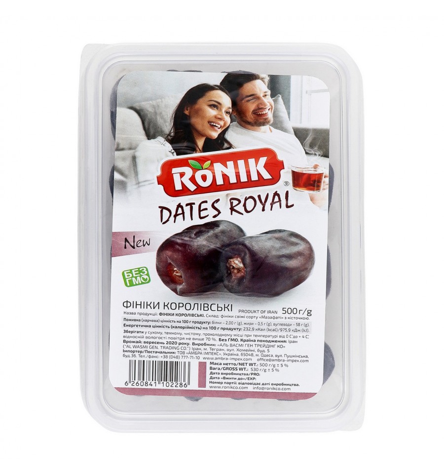 Фініки Ronik свіжі з кісточкою 550г. Склад: фініки свіжі з кісточкою. Без ГМО. Енергетична цінність продукту: 975.9кДж/100г, 232.9ккал/100г. Поживна (харчова) цінність продукту: білки - 2г/100г, жири - 0.5г/100г, вуглеводи - 58г/100г. Умови зберігання: зберігати за температури 0..+4ºC і відносній вологості повітря не більше 70%. Чисте, сухе, прохолодне місце. Термін придатності: 2 роки. Країна виробник: Туреччина. Виробничі потужності та адреса виробничих потужностей: Kalemoglu Tarim Urun. Ayak. Nak, вул. Батталгарі, №39/А, Карабаглар Демірчі, Туреччина. Імпортер та адреса імпортера: ТОВ Амбра Імпекс, вул. Італійська, буд. 36, м. Одеса, Україна, 65048. Маса нетто: 550г.