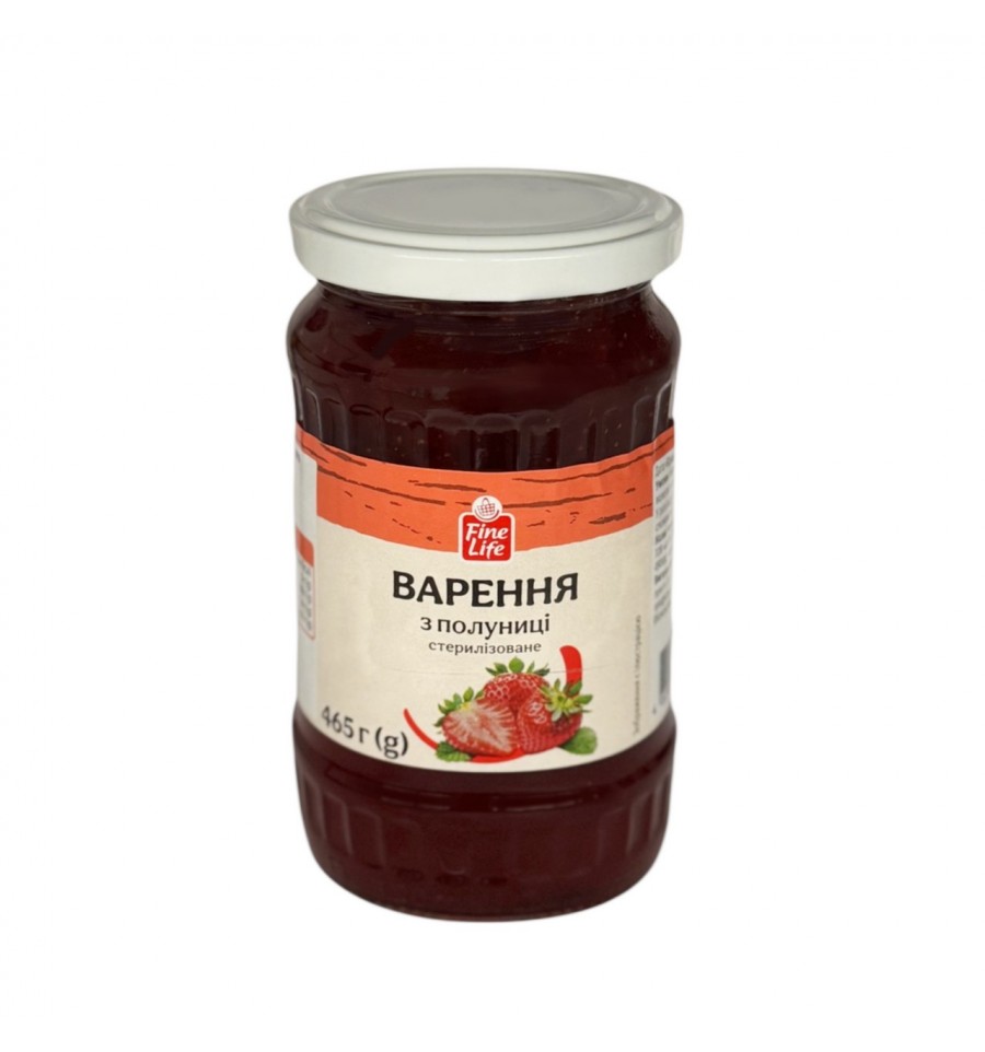 Варення Fine Life з полуниці стерилізоване вищий сорт 465г. Склад: цукор, полуниця швидкозаморожена 40%. Енергетична цінність продукту: 1170кДж/100г, 275ккал/100г. Поживна (харчова) цінність продукту: білки - 0.4г/100г, жири - 0.2г/100г, насичені жири - 0г/100г, вуглеводи - 68г/100г, з них цукри - 68г/100г, сіль - 0.02г/100г. Рекомендований спосіб приготування/вживання: продукт готовий до споживання. У разі відсутності хлопка під час відкривання банки, продукт споживати не можна. Умови зберігання: зберігати за температури 0..+25ºC і відносній вологості повітря не більше 75%. Термін придатності: 2 роки. Країна виробник: Україна. Виробник та адреса виробника: ТОВ Фіта Трейд, просп. Богдана Хмельницького, 139, м. Дніпро, Україна, 49000. Оператор ринку та адреса оператора ринку: ТОВ Фіта Трейд, просп. Богдана Хмельницького, 139, м. Дніпро, Україна, 49000. Виготовлено на замовлення та адреса замовника: ТОВ Метро Кеш енд Кері Україна, просп. П. Григоренка, 43, м. Київ, Україна, 02140. Маса нетто: 465г.