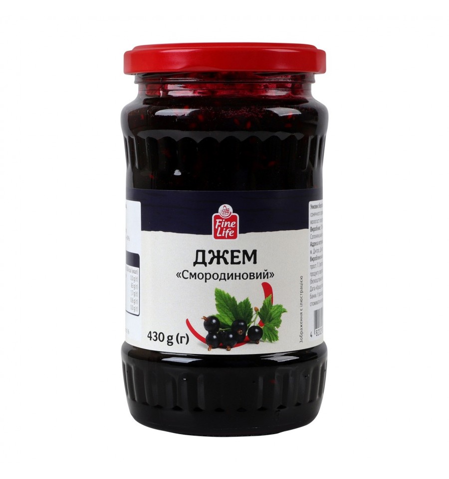 Джем Fine Life Смородиновий стерилізований 430г. Склад: цукор - 60%, смородина швидкозаморожена - 40%. Енергетична цінність продукту: 1119кДж/100г, 268ккал/100г. Поживна (харчова) цінність продукту: білки - 0.6г/100г, жири - <0.5г/100г, насичені жири - 0г/100г, вуглеводи - 66г/100г, з них цукри - 63г/100г, сіль - 0г/100г. Умови зберігання: зберігати за температури 0..+25ºC і відносній вологості повітря не більше 75%. Без потрапляння прямих сонячних променів. Застереження/міри безпеки: у разі відсутності хлопка під час відкривання банки, продукт споживати не можна. Термін придатності: 2 роки. Країна виробник: Україна. Виробник та адреса виробника: ТОВ Мастер-Фуд, вул. Гагаріна, 26, с-ще Солоне, Солонянський р-н, Дніпропетровська обл., Україна, 52400. Адреса виробничих потужностей: вул. Танцюрина Балка, 6, м. Дніпро, Дніпропетровська обл., Україна, 49035. Маса нетто: 430г.