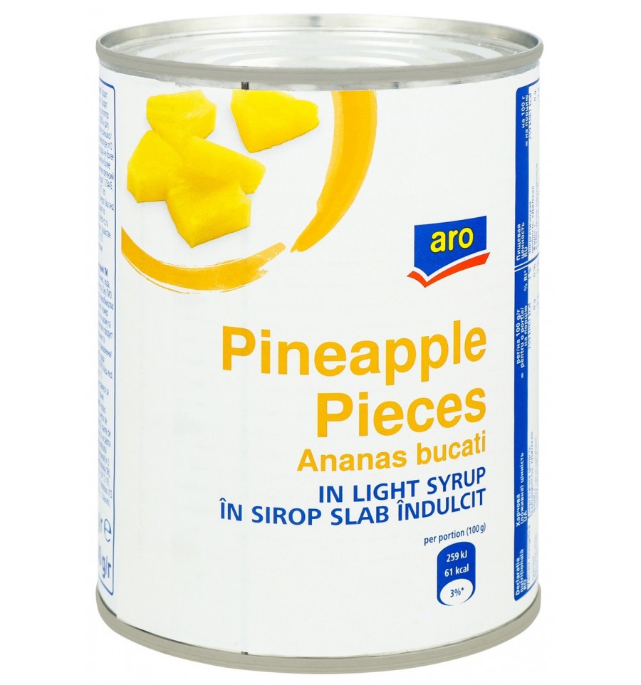 Ананас шматочками в легкому сиропі. Стерилізований продукт. Склад: ананас, вода, цукор, регулятор кислотності (лимонна кислота). Енергетична цінність: 270 кДж/64 ккал. Жири - 0 г, з них насичені - 0 г, вуглеводи – 15,5 г, з них цукри – 15 г, білки - 0 г, сіль – 0 г. "Краще спожити до:" та дата виробництва: зазначені на верхній або нижній частині банки. Номер партії відповідає даті виробництва. Зберігати в сухому та прохолодному місці. Після відкриття, перемістити продукт у контейнер, зберігати в холодильнику протягом 2 діб. Країна походження: Індонезія. Виготовлено на замовлення/Імпортер: ТОВ "МЕТРО Кеш енд Кері Україна", 02140, Україна, м. Київ, просп. П. Григоренка, 43. З питань щодо продукту звертайтеся за телефоном гарячої лінії: 0 800 501 401 (безкоштовно в межах України). Маса нетто: 560г. Маса нетто основного продукту: 340г.