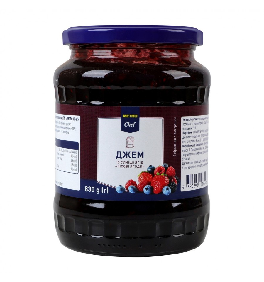 Джем Metro Chef Лісові ягоди із суміші ягід стерилізований 830г. Склад: цукор - 60%, ожина швидкозаморожена - 14%, чорниця швидкозаморожена - 14%, полуниця швидкозаморожена - 4%, малина швидкозаморожена - 4%, смородина швидкозаморожена - 4%. Енергетична цінність продукту: 1087кДж/100г, 260ккал/100г. Поживна (харчова) цінність продукту: білки - <0.5г/100г, жири - <0.5г/100г, насичені жири - 0г/100г, вуглеводи - 65г/100г, з них цукри - 63г/100г, сіль - 0г/100г. Умови зберігання: зберігати за температури 0..+25ºC і відносній вологості повітря не більше 75%. Без потрапляння прямих сонячних променів. Застереження/міри безпеки: у разі відсутності хлопка під час відкривання банки, продукт споживати не можна. Термін придатності: 2 роки. Країна виробник: Україна. Виробник та адреса виробника: ТОВ Мастер-Фуд, вул. Гагаріна, 26, с-ще Солоне, Солонянський р-н, Дніпропетровська обл., Україна, 52400. Адреса виробничих потужностей: вул. Танцюрина Балка, 6, м. Дніпро, Дніпропетровська обл., Україна, 49035. Маса нетто: 830г.