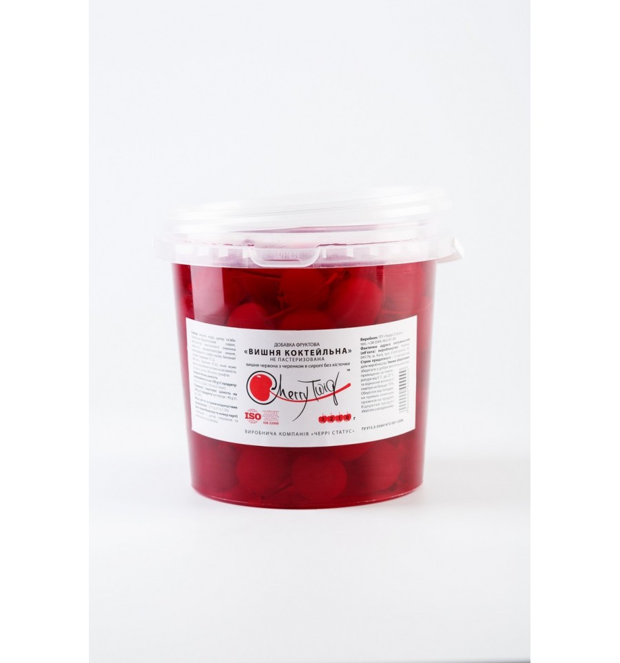 Вишня коктейльна червона непастеризована 1.21кг. Склад: вишня, цукор, вода, регулятор кислотності лимонна кислота, ароматизатор "Вишня", консерванти: сорбат калію, бензоат натрію, барвник кармуазин. Алергени: містить сульфіти. Eнергетична цінність на 100г продукту: 682,4 ккал / 163 кДж, Жири - 0,011 г, Насичені жири - 0,003 г, Вуглеводи - 40,05 г, Цукри - 40,0 г, Білки - 0,13 г, Сіль - 0,005 г. Термін придатності - 1 рік. Зберігати при температурі від 0°С до +25°С та відносній вологості повітря не більше 75%. Оберігати від попадання сонячних променів на продукт. Відкритий продукт зберігати у холодильнику. Виробник: ПП "Черрі Статус". Фактична адреса потужностей (об’єкта) виробництва: Україна, 04176, м. Київ, вул. Електриків, 26. Країна походження: Україна. Маса нетто: 1210 г.