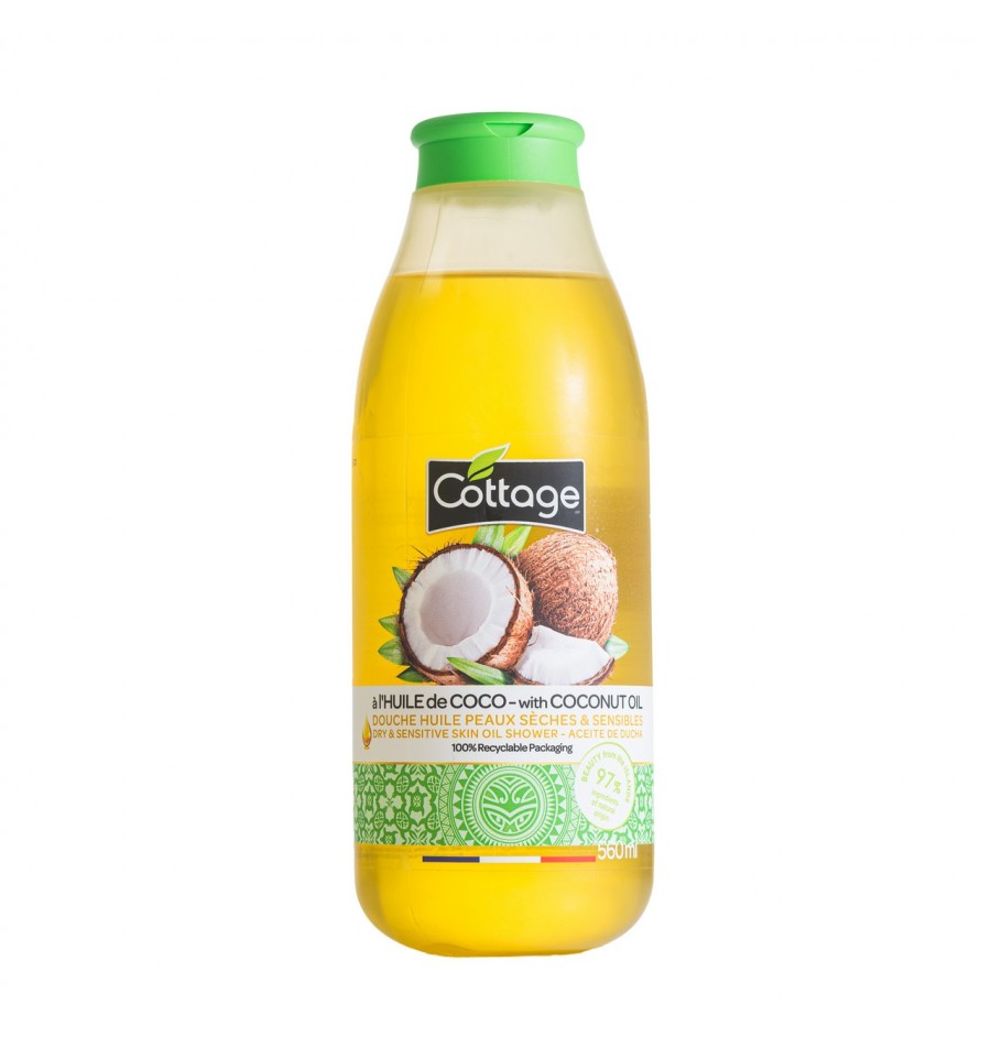 Олія/гель Cottage Екстра живильна Кокосова олія для душу. Цей засіб створено спеціально для догляду за сухою та чутливою шкірою. Він ніжно очищає, інтенсивно живить і запобігає втраті пружності шкіри.97% компонентів натурального походження. Провідним компонентом є кокосова олія, отримана зі свіжої пресованої м’якоті плодів кокосової пальми. Олія кокоса містить суміш жирних кислот, які доглядають за шкірою Аромат: вершково-солодкий з екзотичними акордами. Спосіб застосування Нанесіть невелику кількість засобу на вологу губку чи мочалку або в долоні, масажними рухами розподіліть по тілу, після чого змийте водою. Склад: вода (Aqua), лаурилсульфат амонію, кокамідопропілбетаїн, децилглюкозид, гліцерин, парфумерна композиція (аромат), бензоат натрію, лимонна кислота, кокоглюкозид, гліцерил олеат, бензойна кислота, кокосова олія (Cocos Nucifera), гідроксид натрію, CI 19140 (жовтий 5), токоферол, гідрогенізований цитрат пальмових гліцеридів, CI 15510 (помаранчевий 4), кумарин, гексилциннамаль. Термін придатності - 36 місяців. Зберігати за температури від +5°С до +25°С в гериметично закритій упаковці в сухому приміщенні при відсутності прямого сонячного світла. Виробник: Груп Пантер С.А. З.І., Франція. Адреса виробника: Градіньян Берсоль, Авеню де ла Мадлен 33173, Градіньян Седекс, Франція. Країна: Франція. Маса нетто: 500 мл.