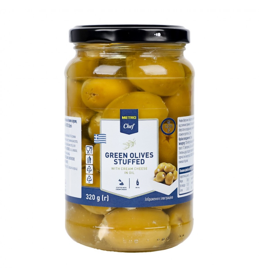 Оливки Metro Chef зелені фаршировані м’яким сиром у соняшниковій олії 320г. Пастеризований продукт. Склад: оливки зелені без кісточки мариновані 56 % (оливки зелені, сіль морська, регулятори кислотності: лимонна кислота, молочна кислота; антиоксидант: аскорбінова кислота), олія соняшникова 34 %, м’який СИР 10 % (МОЛОКО, сіль, закваска, сичужний фермент, загущувач: гуарова камедь). Може містити сліди РИБИ, РАКОПОДІБНИХ, МОЛЮСКІВ, ГОРІХІВ, СЕЛЕРИ, ГІРЧИЦІ та СУЛЬФІТІВ. Енергетична цінність: 1000 кДж/243 ккал, Жири - 26 г, Насичені жири - 4,4 г, Вуглеводи - 1 г, Цукри – 0,3 г, Білки - 2,4 г, Сіль – 4,0 г. Дата «Краще спожити до» та номер партії (L): вказані на кришці банки. Умови зберігання: зберігати у сухому прохолодному місці, подалі від сонячних променів. Після відкриття, продукт зберігати в холодильнику, у маринаді, та спожити протягом 7 днів. Імпортер: ТОВ "Метро Кеш енд Кері Україна". Адреса імпортера: 02140, Україна, м.Київ, просп.П.Григоренка, буд. 43 (www.metro.ua). З питань щодо продукту та прийняття претензій звертайтесь за тел. гарячої лінії імпортера 0800 501 401 (безкоштовно в межах України). Країна походження: Греція. Маса нетто: 320 г. Маса основного продукту: 210 г.
